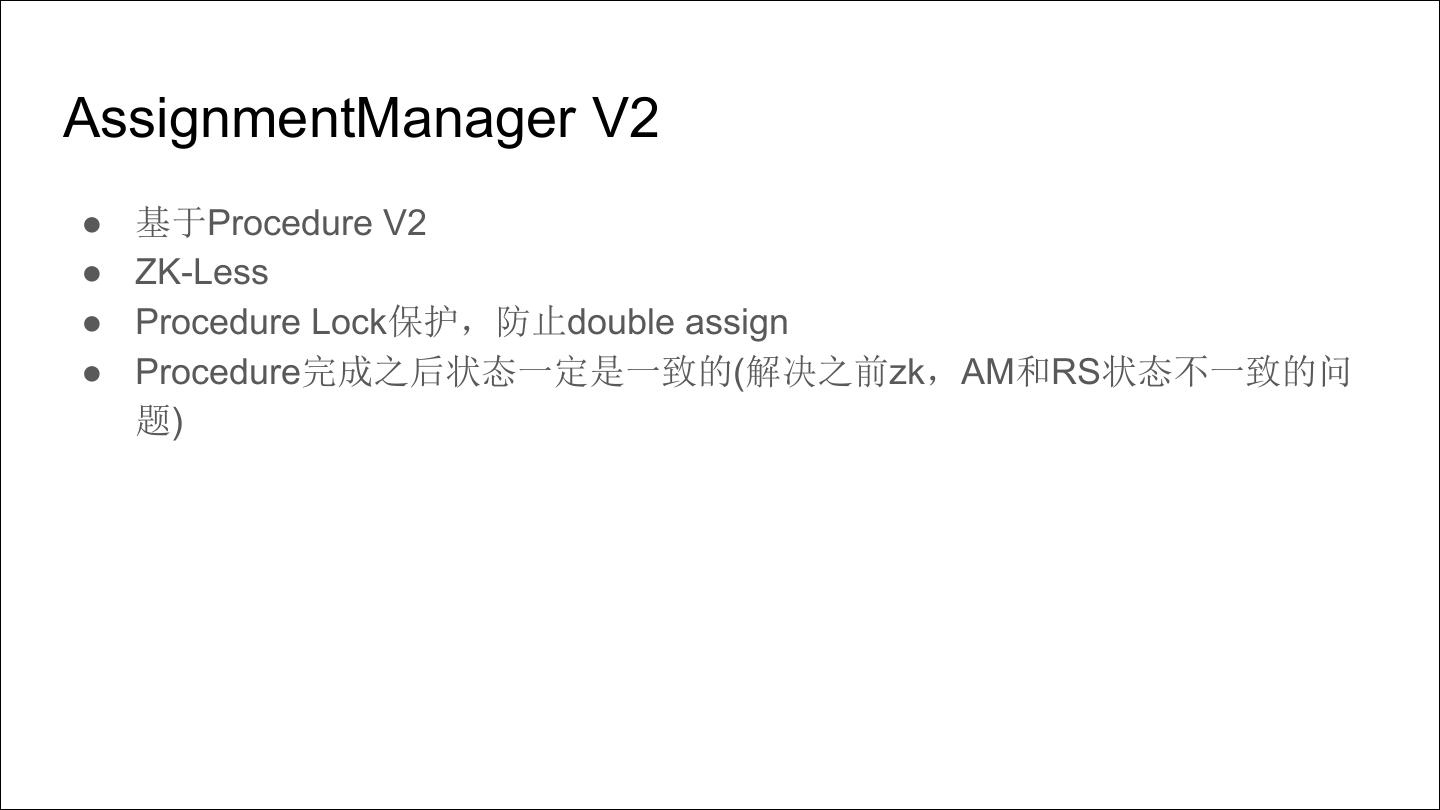 8 .AssignmentManager V2 ● 基于Procedure V2 ● ZK-Less ● Procedure Lock保护,防止double assign ● Procedure完成之后状态一定是一致的(解决之前zk,AM和RS状态不一致的问 题)