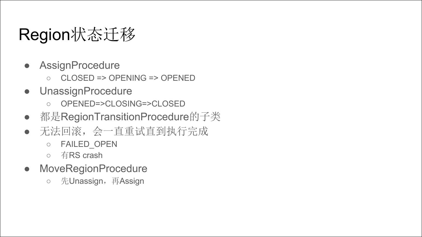 10 .Region状态迁移 ● AssignProcedure ○ CLOSED => OPENING => OPENED ● UnassignProcedure ○ OPENED=>CLOSING=>CLOSED ● 都是RegionTransitionProcedure的子类 ● 无法回滚,会一直重试直到执行完成 ○ FAILED_OPEN ○ 有RS crash ● MoveRegionProcedure ○ 先Unassign,再Assign