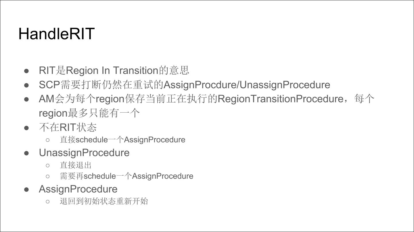 12 .HandleRIT ● RIT是Region In Transition的意思 ● SCP需要打断仍然在重试的AssignProcdure/UnassignProcedure ● AM会为每个region保存当前正在执行的RegionTransitionProcedure,每个 region最多只能有一个 ● 不在RIT状态 ○ 直接schedule一个AssignProcedure ● UnassignProcedure ○ 直接退出 ○ 需要再schedule一个AssignProcedure ● AssignProcedure ○ 退回到初始状态重新开始