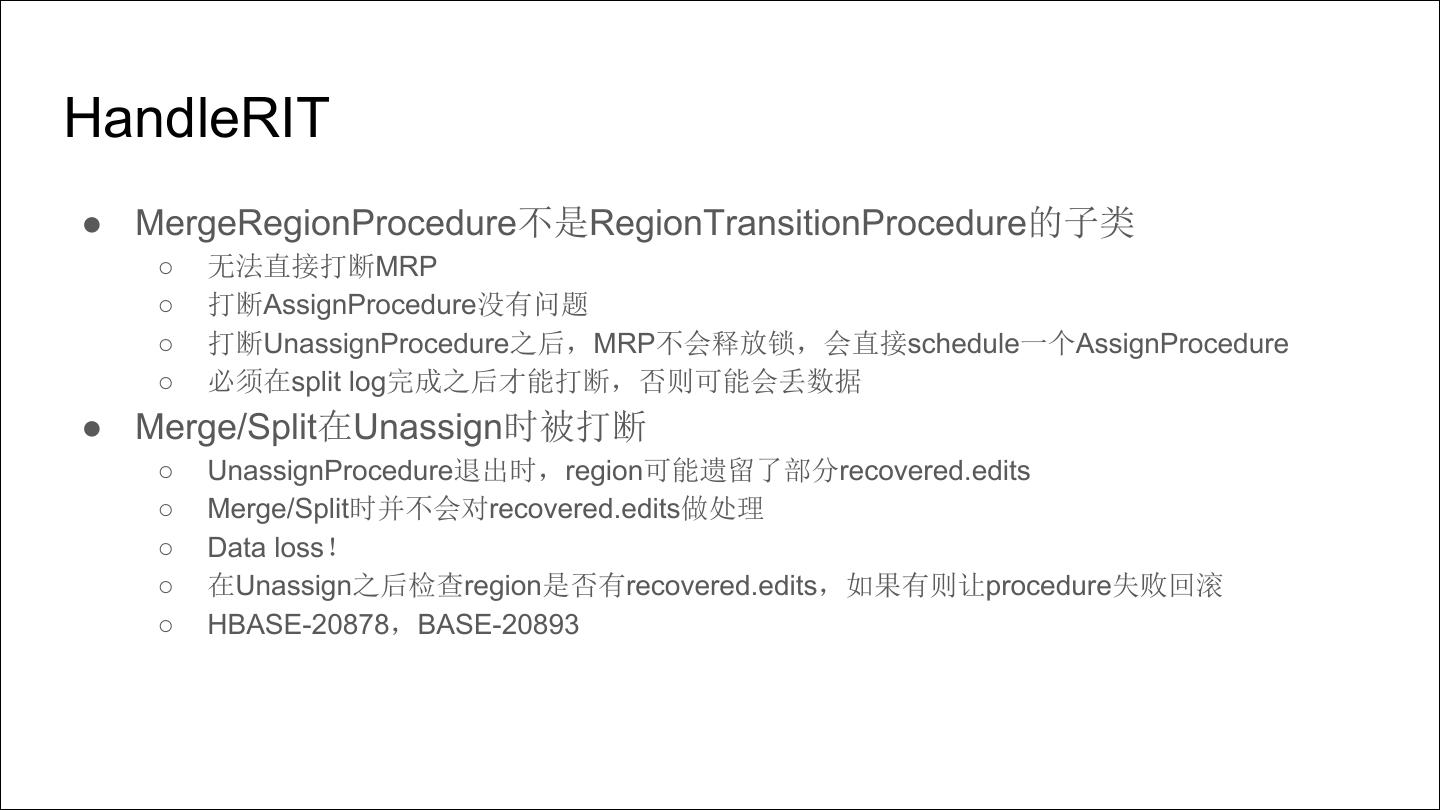 13 .HandleRIT ● MergeRegionProcedure不是RegionTransitionProcedure的子类 ○ 无法直接打断MRP ○ 打断AssignProcedure没有问题 ○ 打断UnassignProcedure之后,MRP不会释放锁,会直接schedule一个AssignProcedure ○ 必须在split log完成之后才能打断,否则可能会丢数据 ● Merge/Split在Unassign时被打断 ○ UnassignProcedure退出时,region可能遗留了部分recovered.edits ○ Merge/Split时并不会对recovered.edits做处理 ○ Data loss! ○ 在Unassign之后检查region是否有recovered.edits,如果有则让procedure失败回滚 ○ HBASE-20878,BASE-20893