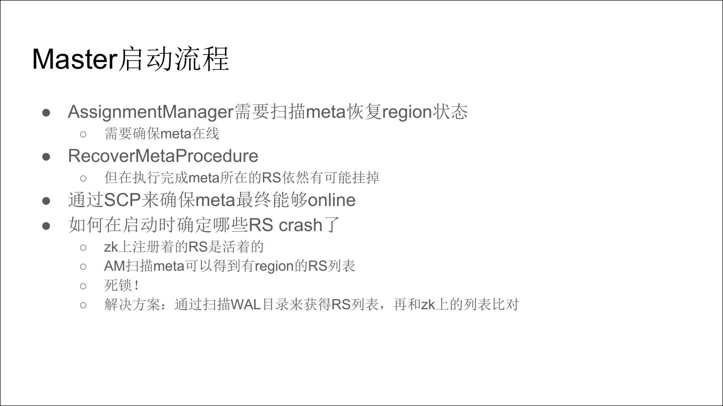 14 .Master启动流程 ● AssignmentManager需要扫描meta恢复region状态 ○ 需要确保meta在线 ● RecoverMetaProcedure ○ 但在执行完成meta所在的RS依然有可能挂掉 ● 通过SCP来确保meta最终能够online ● 如何在启动时确定哪些RS crash了 ○ zk上注册着的RS是活着的 ○ AM扫描meta可以得到有region的RS列表 ○ 死锁! ○ 解决方案:通过扫描WAL目录来获得RS列表,再和zk上的列表比对