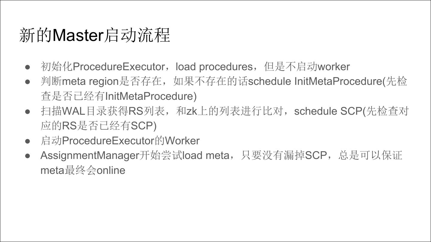 15 .新的Master启动流程 ● 初始化ProcedureExecutor,load procedures,但是不启动worker ● 判断meta region是否存在,如果不存在的话schedule InitMetaProcedure(先检 查是否已经有InitMetaProcedure) ● 扫描WAL目录获得RS列表,和zk上的列表进行比对,schedule SCP(先检查对 应的RS是否已经有SCP) ● 启动ProcedureExecutor的Worker ● AssignmentManager开始尝试load meta,只要没有漏掉SCP,总是可以保证 meta最终会online