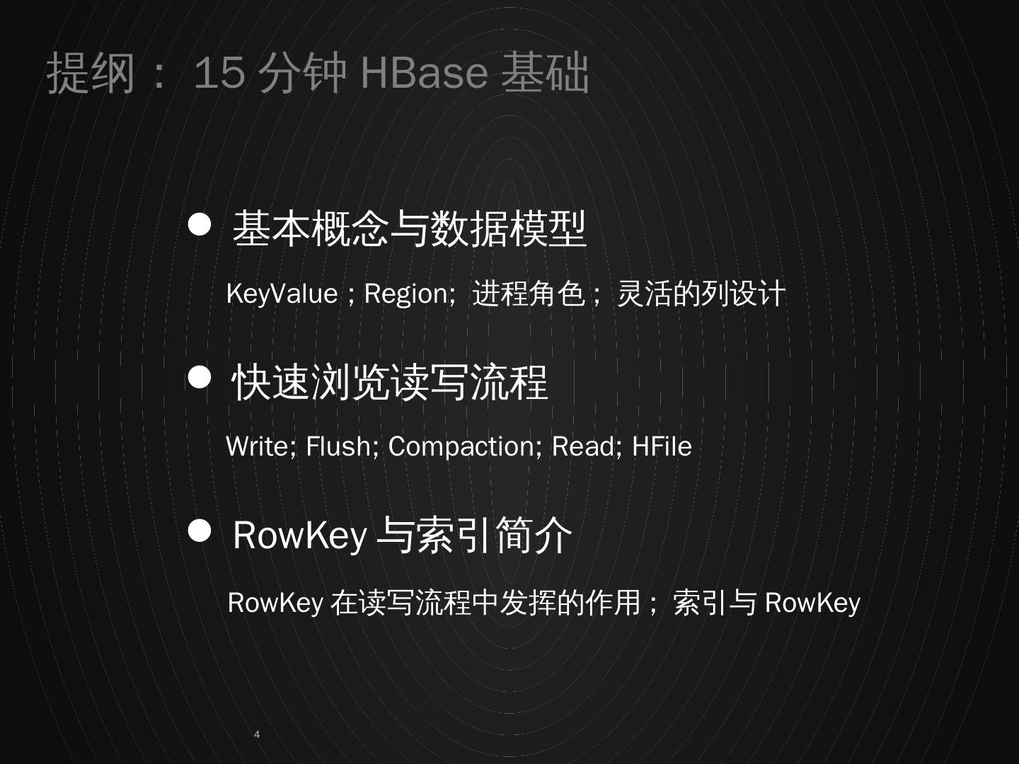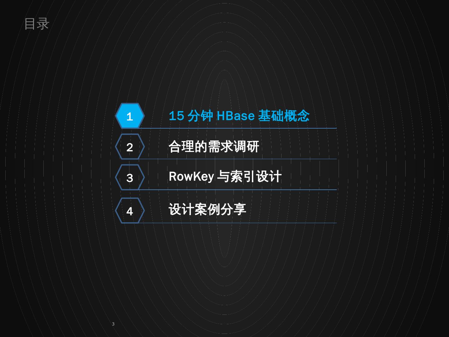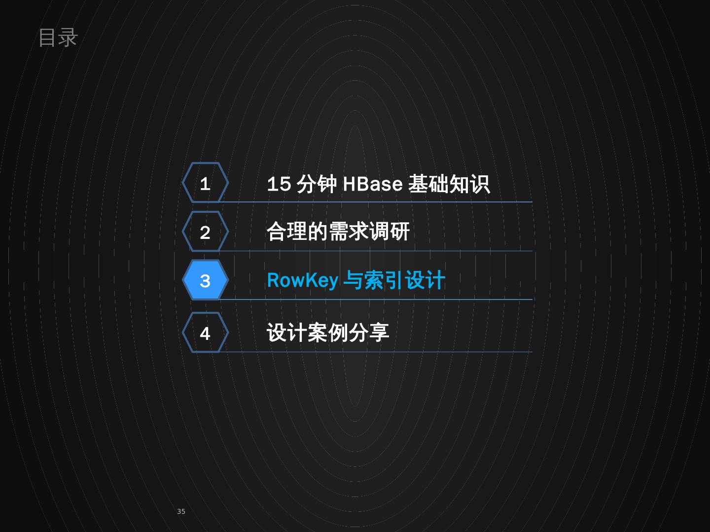 3 .1 15 分钟 HBase 基础概念 2 合理的需求调研 目录 3 RowKey 与索引设计 4 设计案例分享