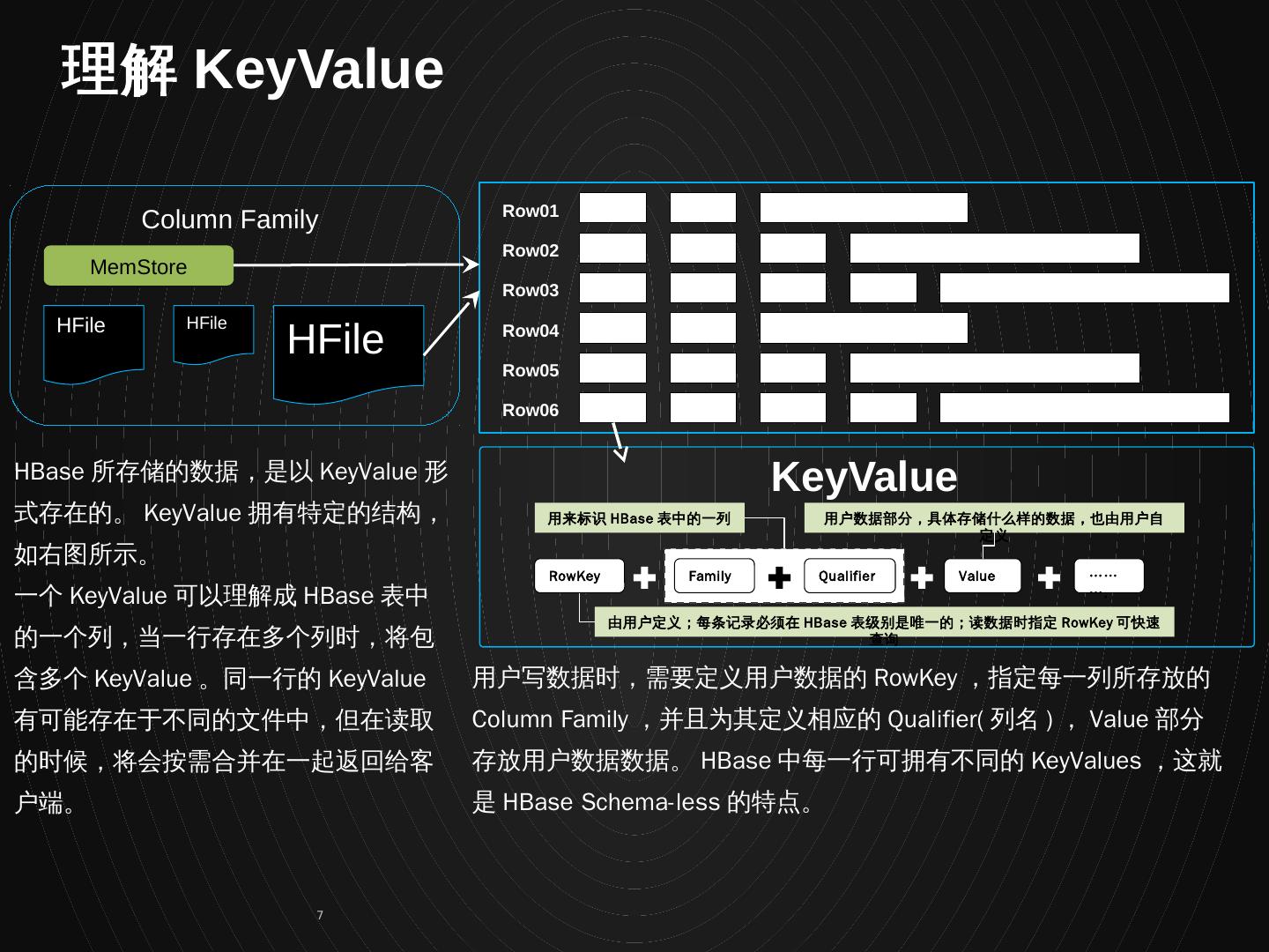 6 .Client ZooKeeper Master RegionServer NameNode DataNode DDL Reqests DML Reqests Routing Requests Meta 表的路由信息在 ZooKeeper 中; Master 负责表管理操作, Region 到各个 RegionServer 的分配以及 RegionServer Failover 的处理等; RegionServer 提供数据读写服务。 HBase 的所有数据文件都存放在 HDFS 中。 关键进程角色