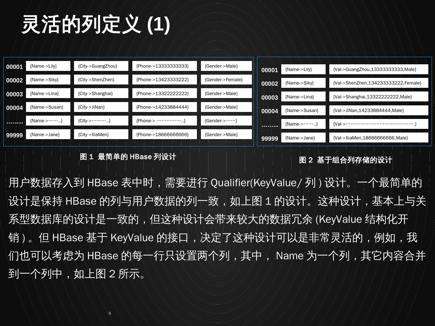 9 .{Name->Lily} 00001 00002 00003 00004 ……... 99999 {City->GuangZhou} {Phone->13333333333} {Gender->Male} {Name->Siky} {City->ShenZhen} {Phone->13423333222} {Gender->Female} {Name->Lina} {City->Shanghai} {Phone->13322222222} {Gender->Male} {Name->Susan} {City->JiNan} {Phone->14233884444} {Gender->Male} {Name->……..} {City->………..} {Phone-> ……………..} {Gender->……} {Name->Jane} {City->XiaMen} {Phone->18666666666} {Gender->Male} {Name->Lily} 00001 00002 00003 00004 ……... 99999 {Val->GuangZhou,13333333333,Male} {Name->Siky} {Val->ShenZhen,134233333222,Female} {Name->Lina} {Val->Shanghai,13322222222,Male} {Name->Susan} {Val->JiNan,14233884444,Male} {Name->……..} {Val->…………………………………….} {Name->Jane} {Val->XiaMen,18666666666,Male} 图 2 基于组合列存储的设计 图 1 最简单的 HBase 列设计 用户数据存入到 HBase 表中时,需要进行 Qualifier(KeyValue/ 列 ) 设计。一个最简单的设计是保持 HBase 的列与用户数据的列一致,如上图 1 的设计。这种设计,基本上与关系型数据库的设计是一致的,但这种设计会带来较大的数据冗余 (KeyValue 结构化开销 ) 。但 HBase 基于 KeyValue 的接口,决定了这种设计可以是非常灵活的,例如,我们也可以考虑为 HBase 的每一行只设置两个列,其中, Name 为一个列,其它内容合并到一个列中,如上图 2 所示。 灵活的列定义 (1)