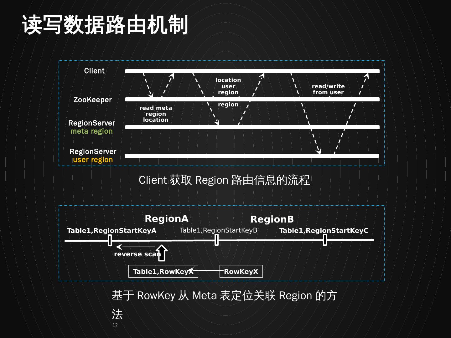12 .Table1,RegionS t artKeyA Table1, RegionStartKeyB Table1, RegionStartKeyC RegionA RegionB RowKeyX Table1,RowKeyX reverse scan Client ZooKeeper RegionServer meta region RegionServer user region read meta region location location user region from meta region read/write from user region 读写数据路由机制 Client 获取 Region 路由信息的流程 基于 RowKey 从 Meta 表定位关联 Region 的方法