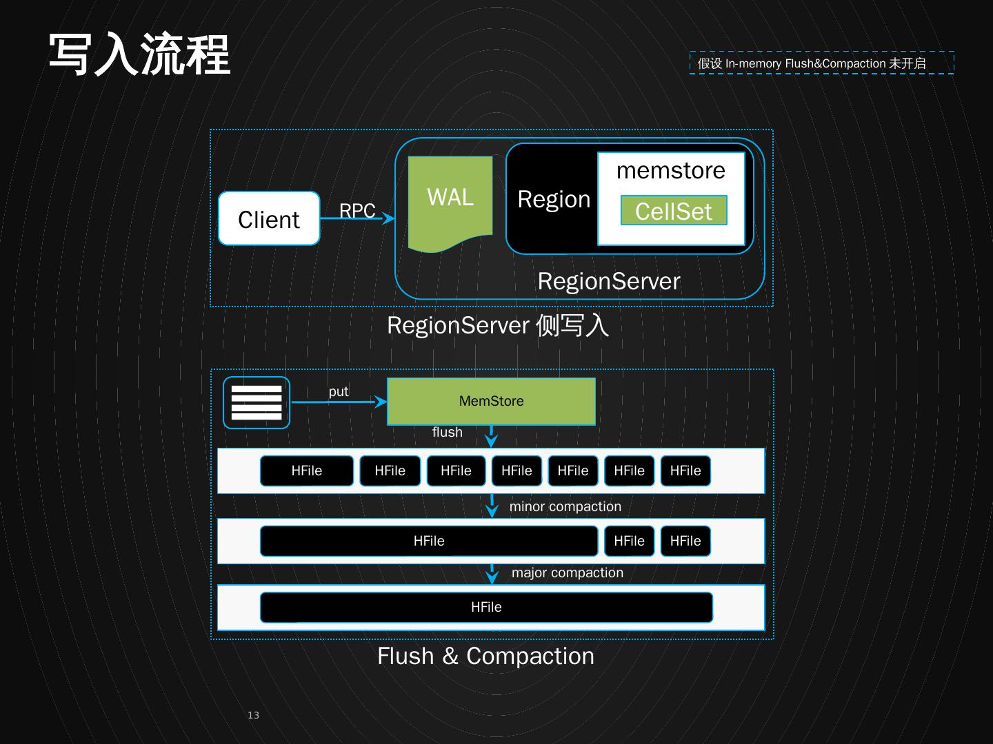 13 .memstore Region CellSet WAL RegionServer Client RPC HFile HFile HFile HFile HFile HFile HFile MemStore HFile HFile HFile HFile minor compaction major compaction flush put 假设 In-memory Flush&Compaction 未开启 写入流程 RegionServer 侧写入 Flush & Compaction