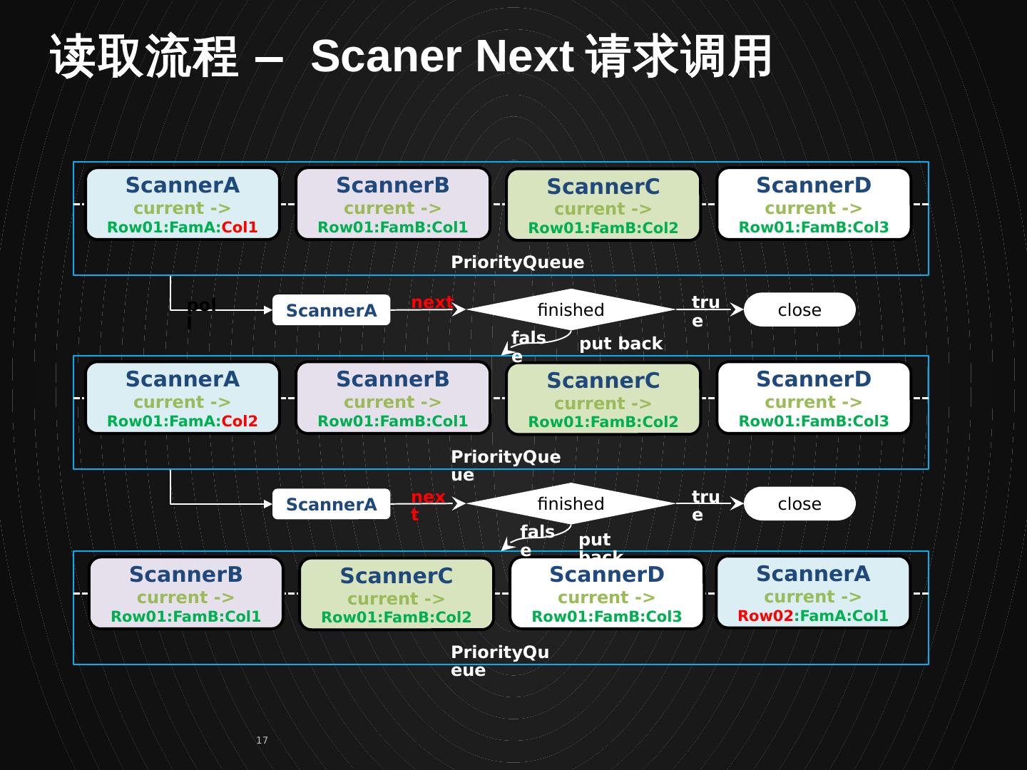 17 .ScannerA current -> Row01:FamA: Col1 ScannerB current -> Row01:FamB:Col1 ScannerD current -> Row01:FamB:Col3 ScannerA ScannerC current -> Row01:FamB:Col2 close finished next true PriorityQueue ScannerA current -> Row01:FamA: Col2 ScannerB current -> Row01:FamB:Col1 ScannerD current -> Row01:FamB:Col3 ScannerA ScannerC current -> Row01:FamB:Col2 close finished next true PriorityQueue ScannerA current -> Row02 :FamA:Col1 ScannerB current -> Row01:FamB:Col1 ScannerD current -> Row01:FamB:Col3 ScannerC current -> Row01:FamB:Col2 PriorityQueue poll false put back false put back 读取流程 – Scaner Next 请求调用