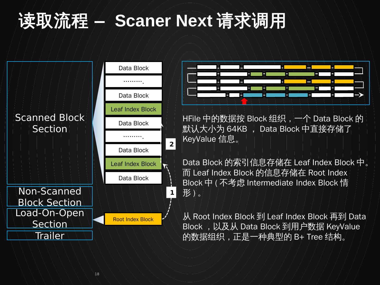 18 .Data Block ………. Data Block Leaf Index Block Data Block ………. Data Block Data Block Scanned Block Section Non-Scanned Block Section Load-On-Open Section Trailer Leaf Index Block Root Index Block 1 2 HFile 中的数据按 Block 组织,一个 Data Block 的默认大小为 64KB , Data Block 中直接存储了 KeyValue 信息。 Data Block 的索引信息存储在 Leaf Index Block 中。而 Leaf Index Block 的信息存储在 Root Index Block 中 ( 不考虑 Intermediate Index Block 情形 ) 。 从 Root Index Block 到 Leaf Index Block 再到 Data Block ,以及从 Data Block 到用户数据 KeyValue 的数据组织,正是一种典型的 B+ Tree 结构。 读取流程 – Scaner Next 请求调用
