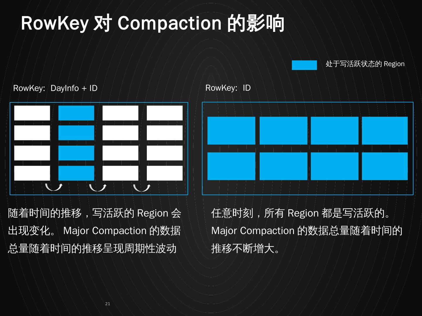 21 .处于写活跃状态的 Region RowKey: DayInfo + ID RowKey: ID 随着时间的推移,写活跃的 Region 会出现变化。 Major Compaction 的数据总量随着时间的推移呈现周期性波动 任意时刻,所有 Region 都是写活跃的。 Major Compaction 的数据总量随着时间的推移不断增大。 RowKey 对 Compaction 的影响