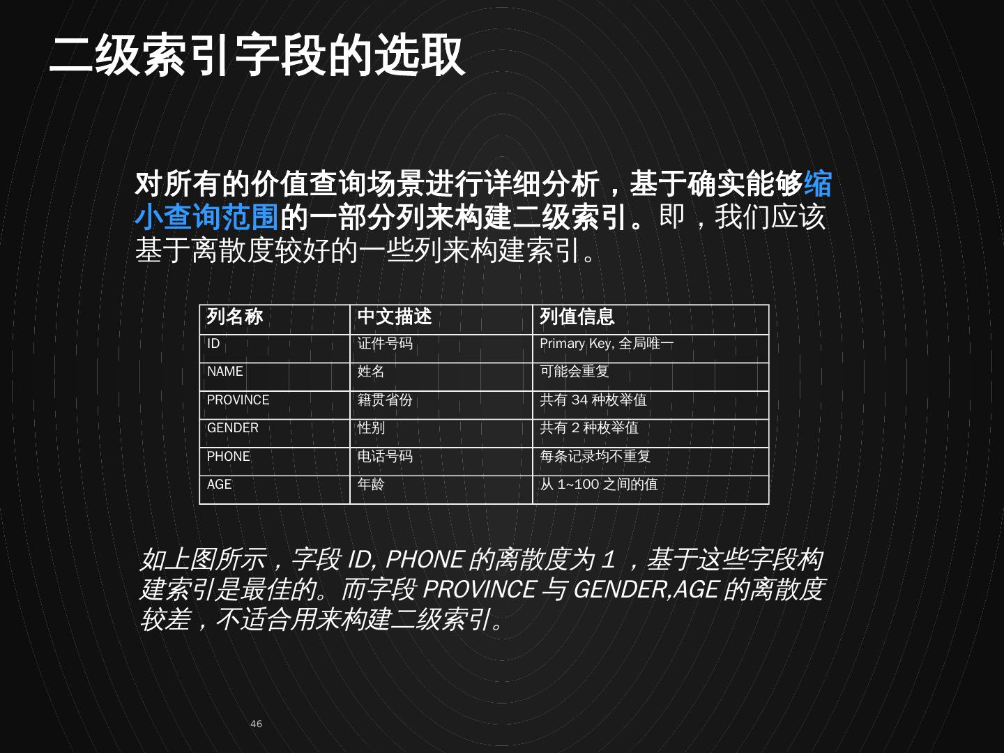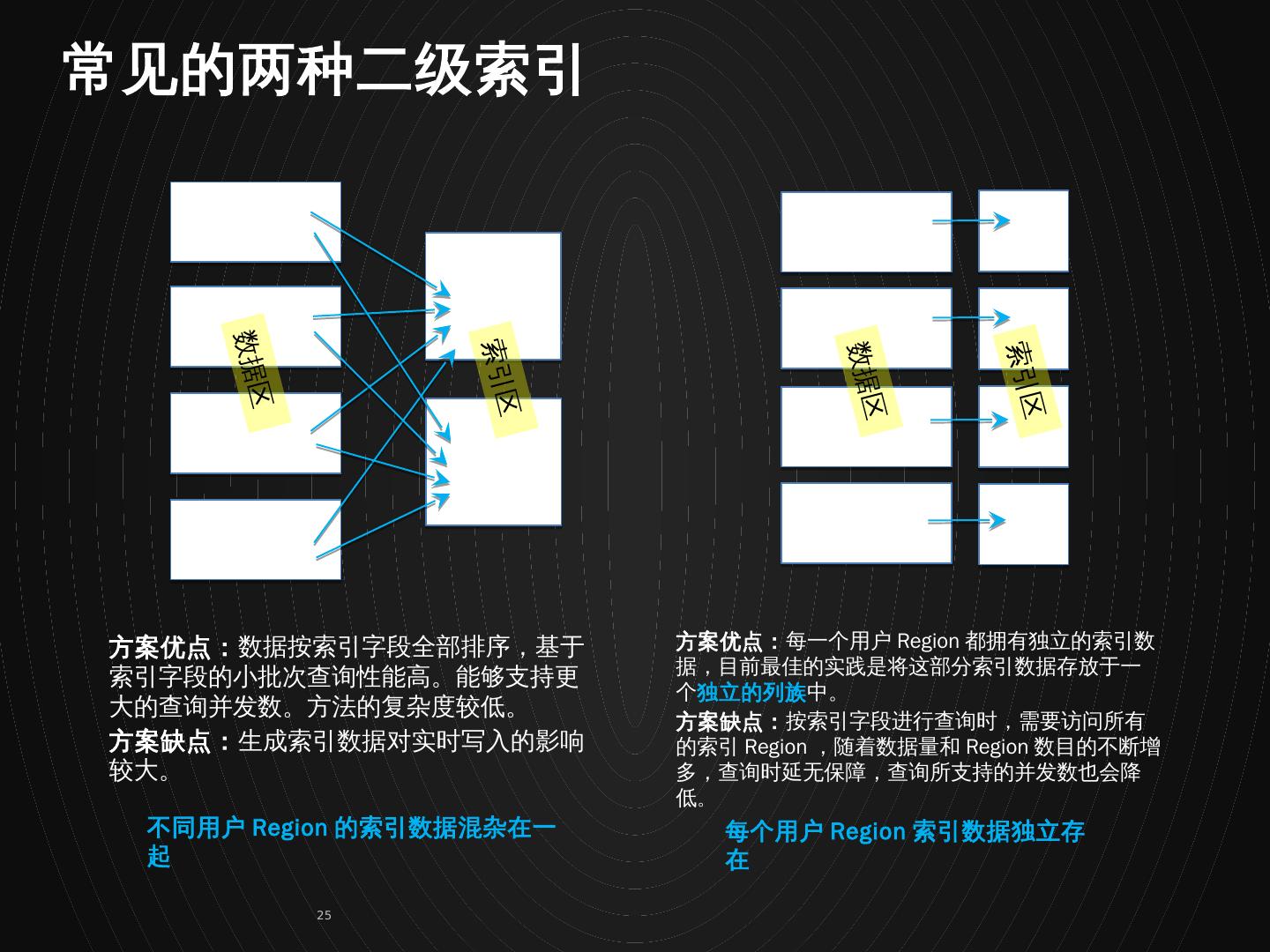 24 .Name Phone ID …… . Ariya 1332222 I0000005 … . … … … … . Li 1384444 I9999999 … . Li 1385555 I0000008 … . Wang 1332323 I0000007 … . Wang 1333232 I0000002 … . … … … … . Wang 1334988 I0012322 … . Wang 1335465 I0040007 … . Wang 1366134 I0070007 … . Wang 1397323 I0052322 … . Wang 1388866 I0112322 … . Wang 1388888 I0900007 … . … … … … . Xiao 1332222 I0000009 … . 如果提供的查询条件能够 尽可能丰富 的描述 RowKey 的 前缀信息 ,则 查询时延 越能得到保障。如下面几种组合条件场景 : Name + Phone + ID Name + Phone Name 如果查询条件不能提供 Name 信息,则 RowKey 的前缀条件是无法确定的,此时只能通过 全表扫描 的方式来查找结果。 一种业务模型的用户数据 RowKey ,只能采用单一结构设计。但事实上,查询场景可能是多维度的。例如,在上面的场景基础上,还需要单独基于 Phone 列进行查询。这是 HBase 二级索引出现的背景。即,二级索引是为了让 HBase 能够提供更多维度的查询能力。 注: HBase 原生并不支持二级索引方案,但基于 HBase 的 KeyValue 数据模型与 API ,可以轻易的构建出二级索引数据。 Phoenix 提供了两种索引方案,而一些大厂家也都提供了自己的二级索引实现 。 RowKey 查询的局限性 / 二级索引需求背景 基于 Name+Phone+ID 构建 RowKey