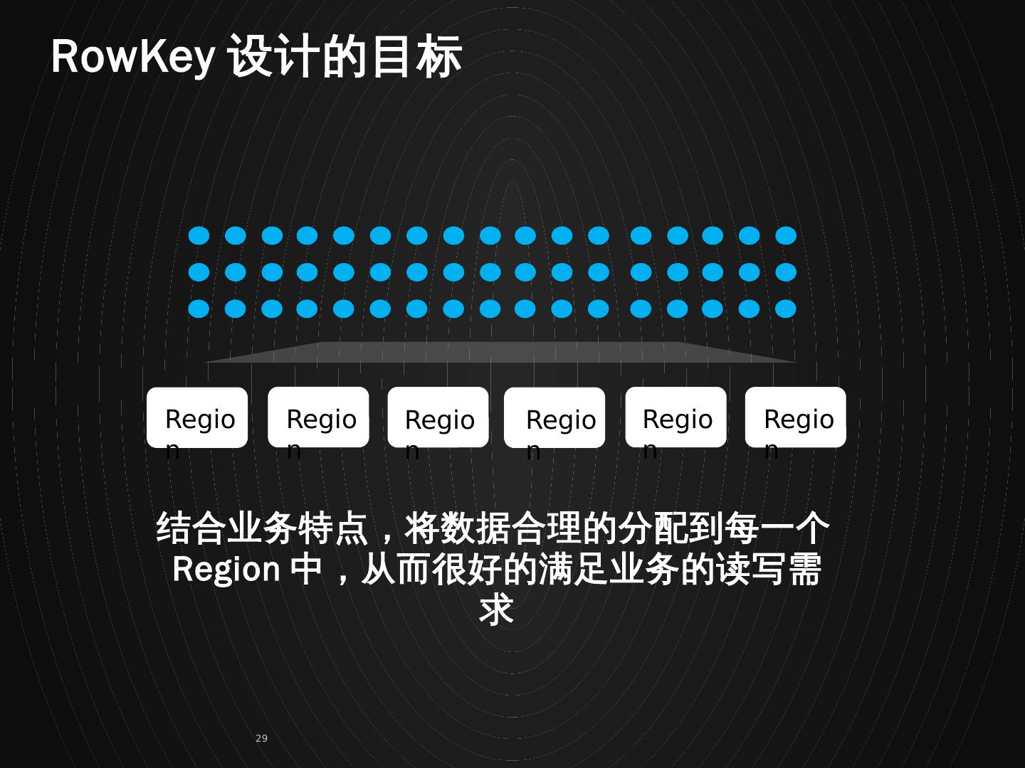 29 .结合业务特点,将数据合理的分配到每一个 Region 中,从而很好的满足业务的读写需求 Region Region Region Region Region Region RowKey 设计的目标