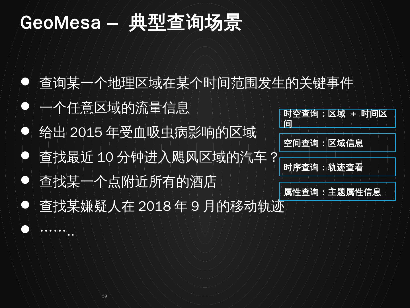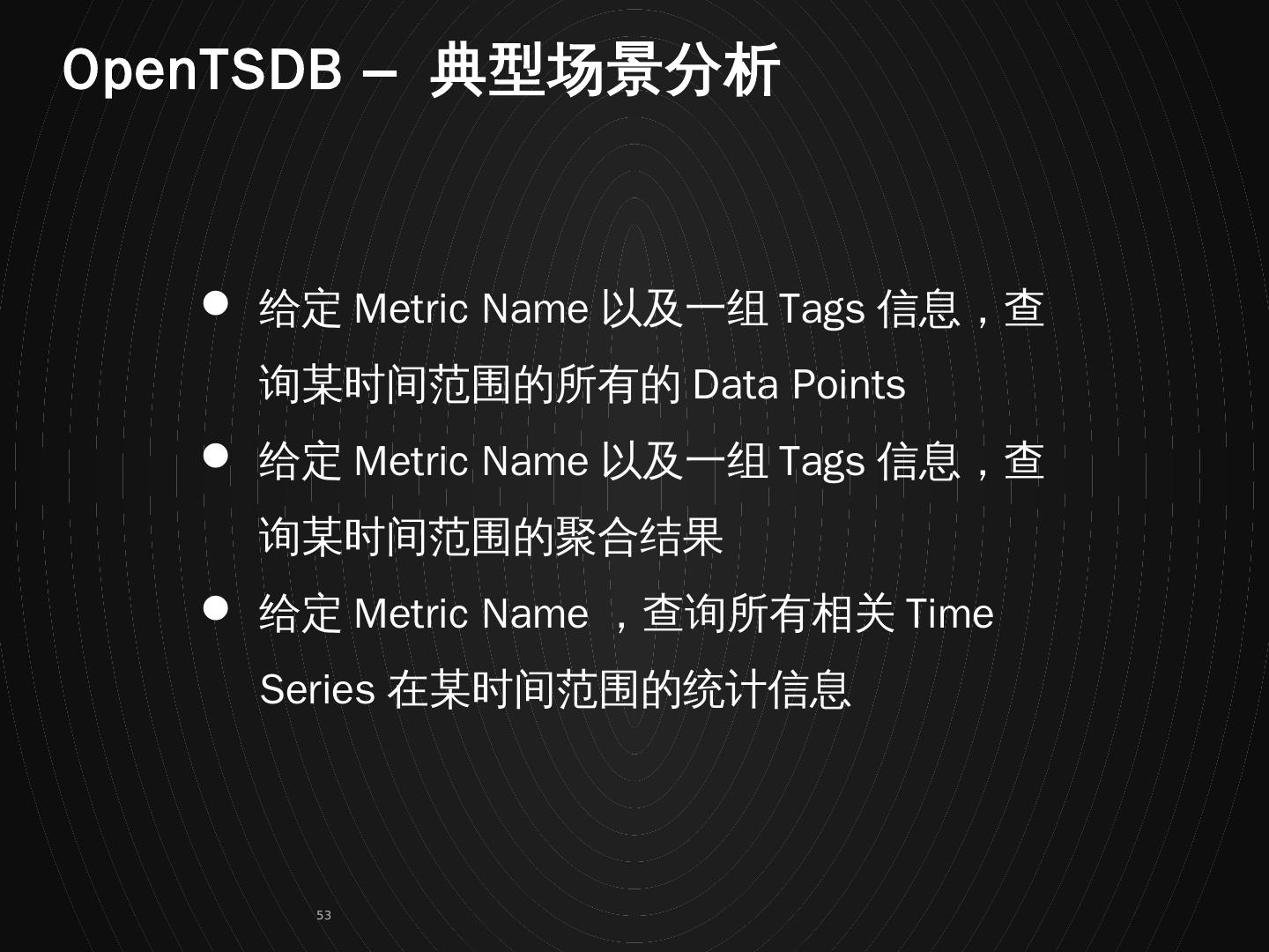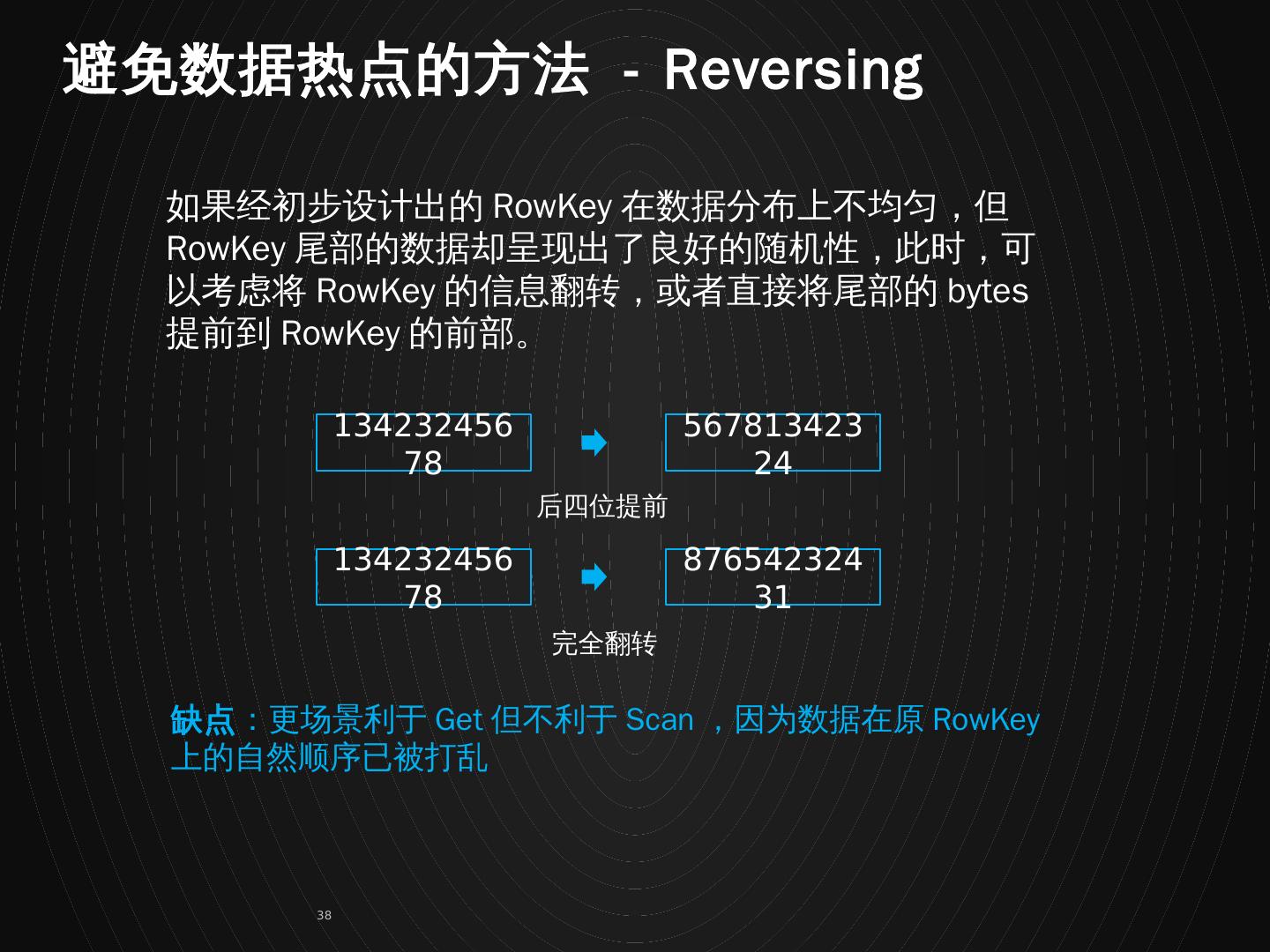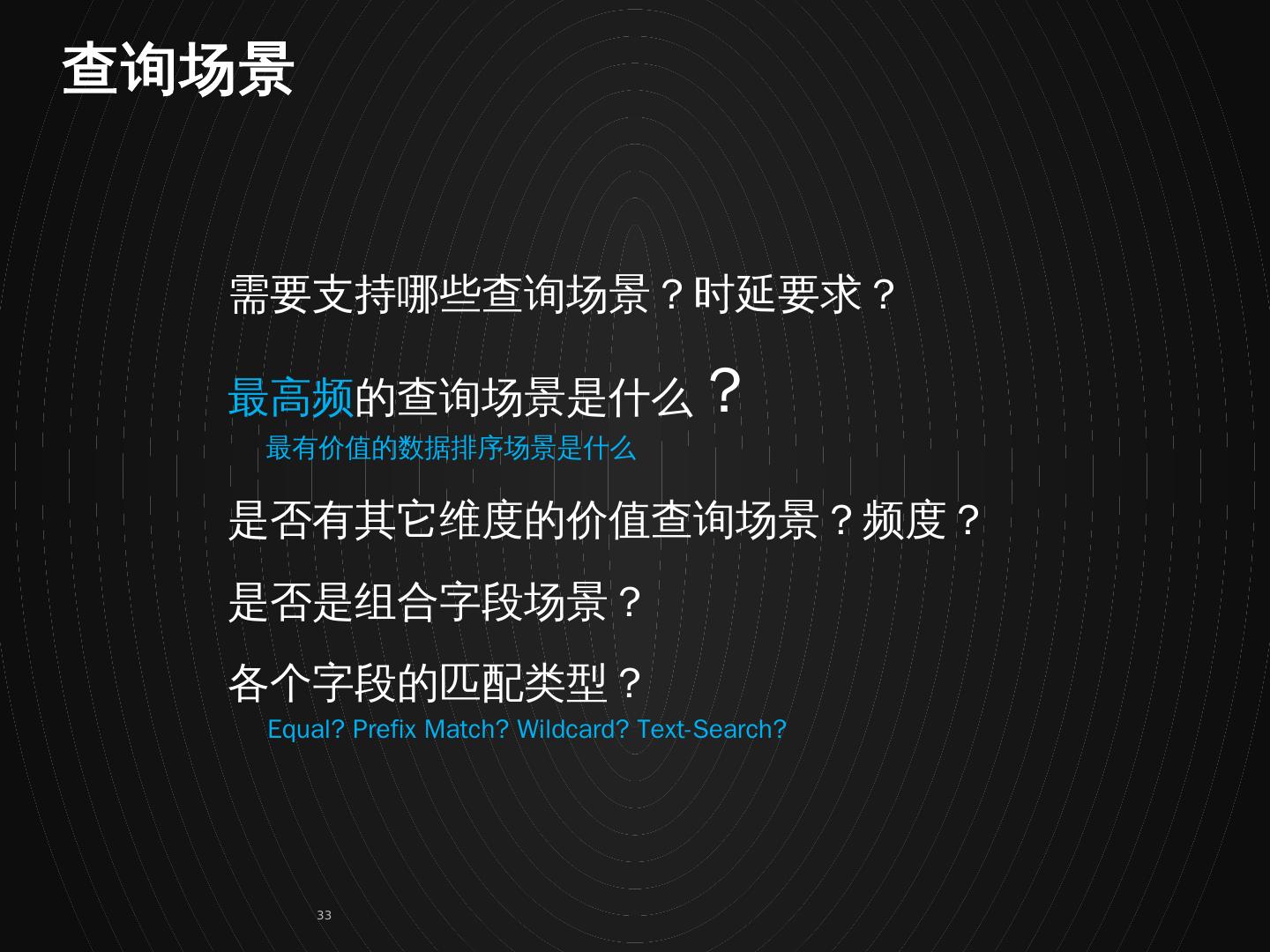 22 .基于 Name+Phone+ID 构建 RowKey Name Phone ID …… . Ariya 1332222 I0000005 … . … … … … . Li 1384444 I9999999 … . Li 1385555 I0000008 … . Wang 1332323 I0000007 … . Wang 1333232 I0000002 … . … … … … . Wang 1334988 I0012322 … . Wang 1335465 I0040007 … . Wang 1366134 I0070007 … . Wang 1397323 I0052322 … . Wang 1388866 I0112322 … . Wang 1388888 I0900007 … . … … … … . Xiao 1332222 I0000009 … . 可很好 / 较好支持的查询场景: 查询场景 1 : Name:Li AND Phone:1384444 AND ID:I9999999 查询场景 2 : Name:Wang AND Phone:1384444 查询场景 3 : Name:Wang 查询场景 4 : Name:Wang AND Phone: 133% 查询场景 2 : Name:Wang AND Phone: 133?323 难以支持的查询场景: 查询场景 5: Phone: 1384444 查询场景 6: ID: I9999999 RowKey 对查询的影响
