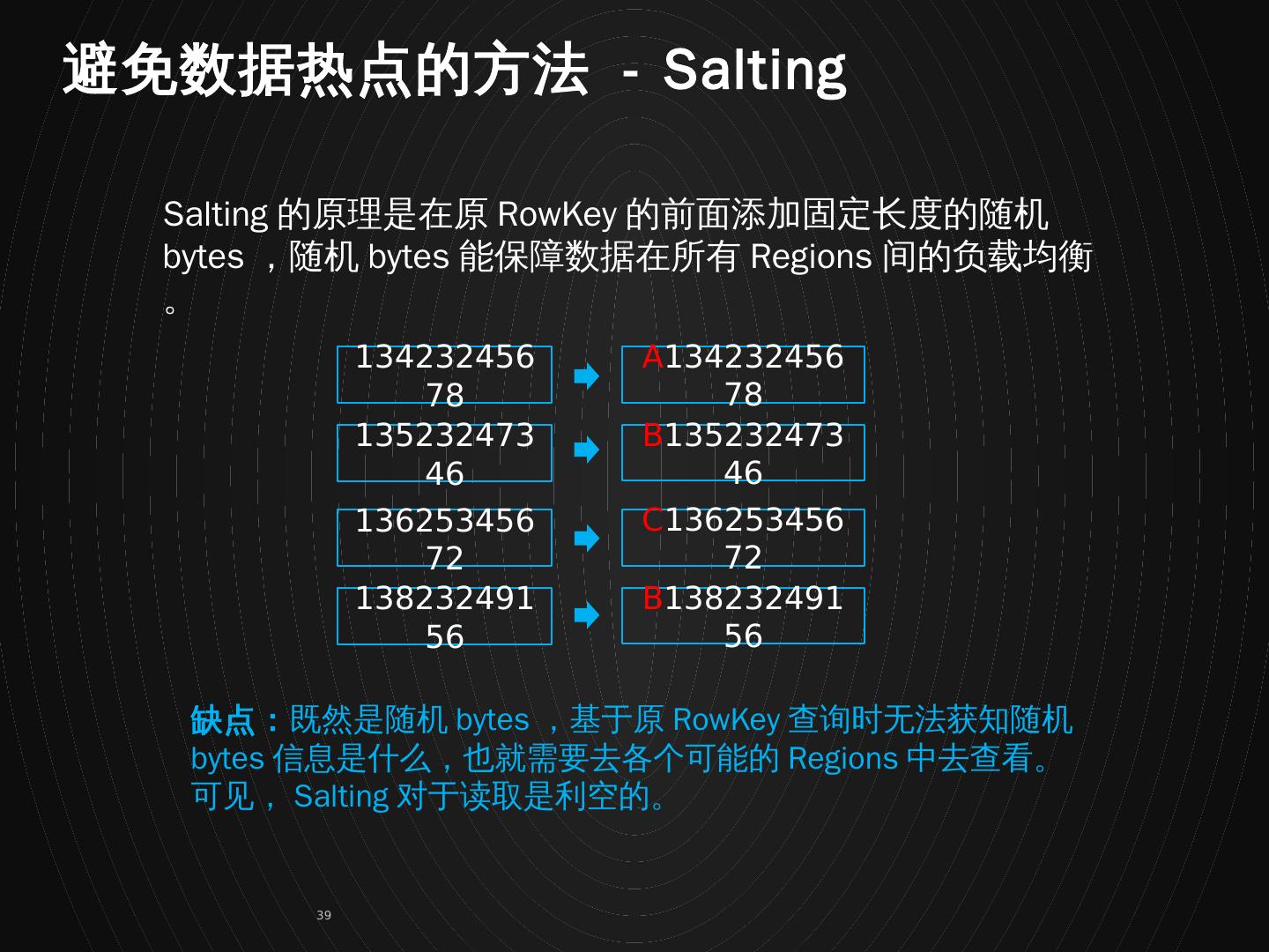 26 .举例说明如何基于 HBase 原生 API 构建二级索引的方法: 假设原始数据的 RowKey 与列定义如下: Put: RowKey -> ID , 列 -> {Name, Phone, Address, …….} 如果我们希望基于 Phone 列构建二级索引,我们可以基于原数据,构建一条新的记录,这个记录的 RowKey 为: Put: RowKey -> Phone + ID , 列 -> {…} 在二级索引的 RowKey 中,包含了数据的 RowKey 信息。这样,既能有效的从 Phone 索引到 ID 信息,又能保证索引 RowKey 的唯一性。 构建二级索引的核心在于 如何设计一个合理的索引 RowKey 。 索引即 RowKey…