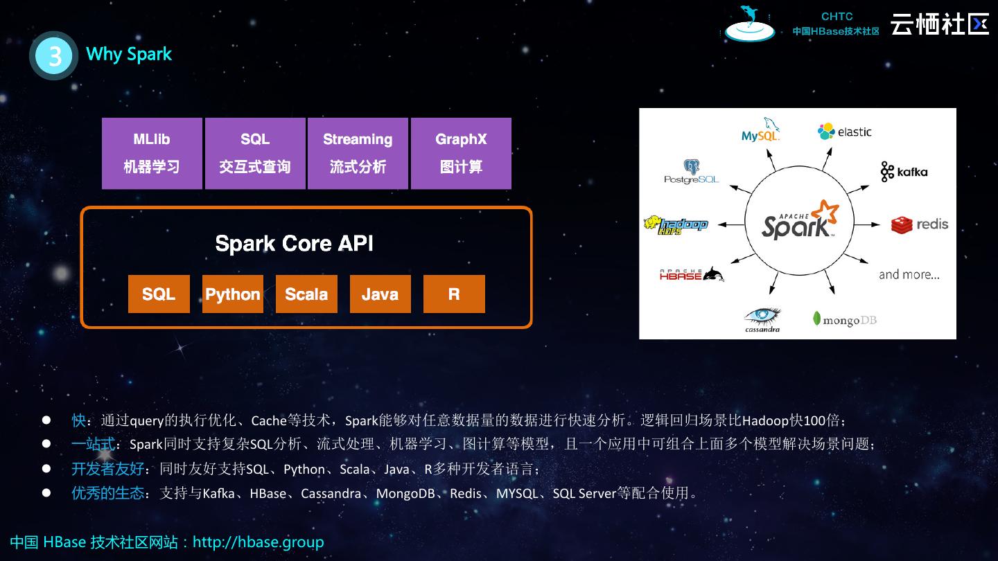 6 . 3 Why Spark l 快:通过query的执行优化、Cache等技术,Spark能够对任意数据量的数据进行快速分析。逻辑回归场景比Hadoop快100倍; l 一站式:Spark同时支持复杂SQL分析、流式处理、机器学习、图计算等模型,且一个应用中可组合上面多个模型解决场景问题; l 开发者友好:同时友好支持SQL、Python、Scala、Java、R多种开发者语言; l 优秀的生态:支持与Ka=a、HBase、Cassandra、MongoDB、Redis、MYSQL、SQL Server等配合使用。 中国 HBase 技术社区网站:http://hbase.group