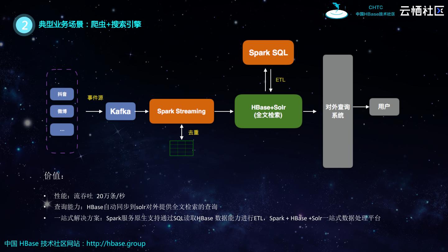 10 . 2 典型业务场景:爬虫+搜索引擎 价值: • 性能:流吞吐 20万条/秒 • 查询能力:HBase自动同步到solr对外提供全文检索的查询 • 一站式解决方案:Spark服务原生支持通过SQL读取HBase 数据能力进行ETL,Spark + HBase +Solr一站式数据处理平台 中国 HBase 技术社区网站:http://hbase.group