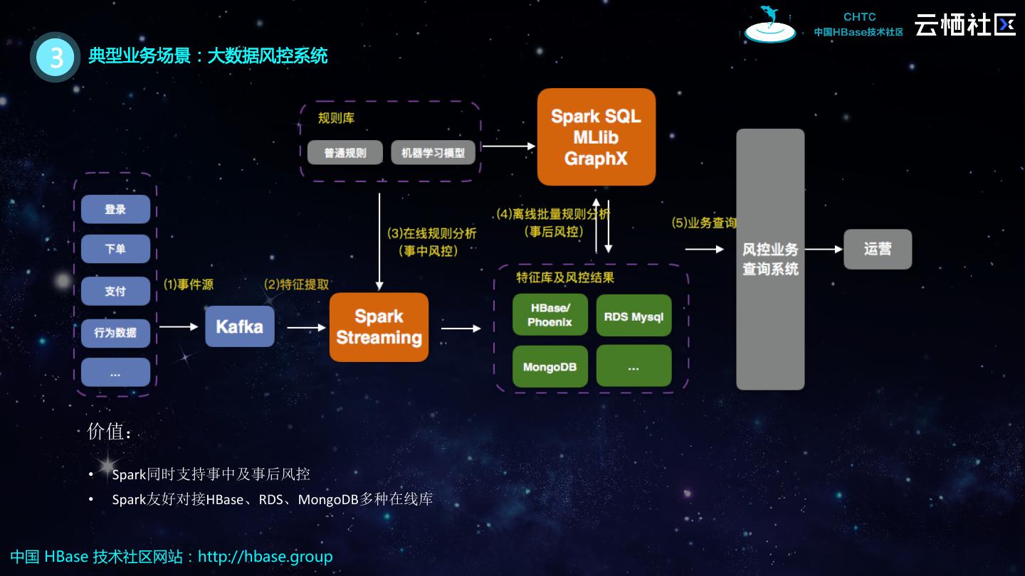 11 . 3 典型业务场景:大数据风控系统 价值: • Spark同时支持事中及事后风控 • Spark友好对接HBase、RDS、MongoDB多种在线库 中国 HBase 技术社区网站:http://hbase.group