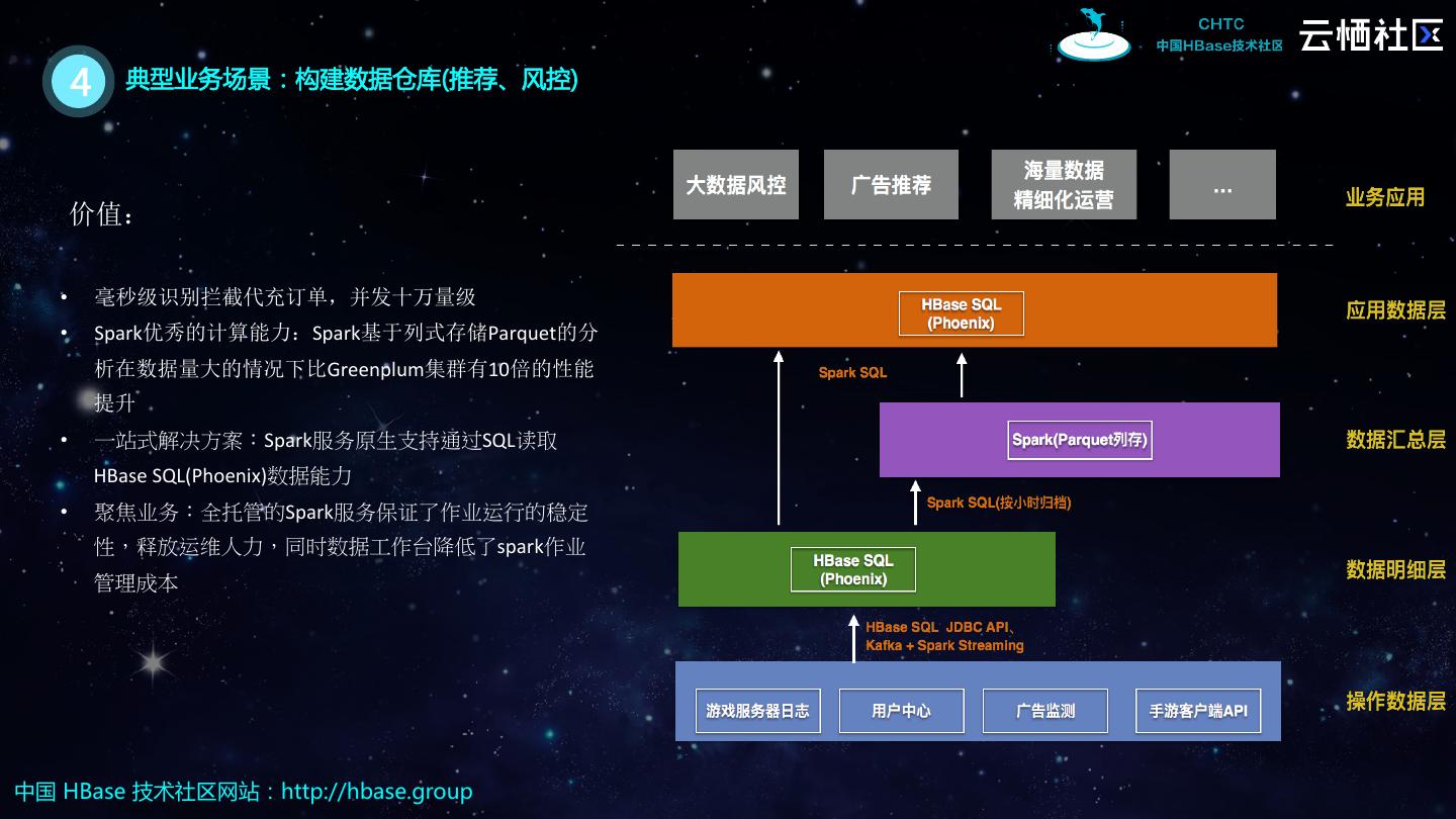12 . 4 典型业务场景:构建数据仓库(推荐、风控) 价值: • 毫秒级识别拦截代充订单,并发十万量级 • Spark优秀的计算能力:Spark基于列式存储Parquet的分 析在数据量大的情况下比Greenplum集群有10倍的性能 提升 • 一站式解决方案:Spark服务原生支持通过SQL读取 HBase SQL(Phoenix)数据能力 • 聚焦业务:全托管的Spark服务保证了作业运行的稳定 性,释放运维人力,同时数据工作台降低了spark作业 管理成本 中国 HBase 技术社区网站:http://hbase.group
