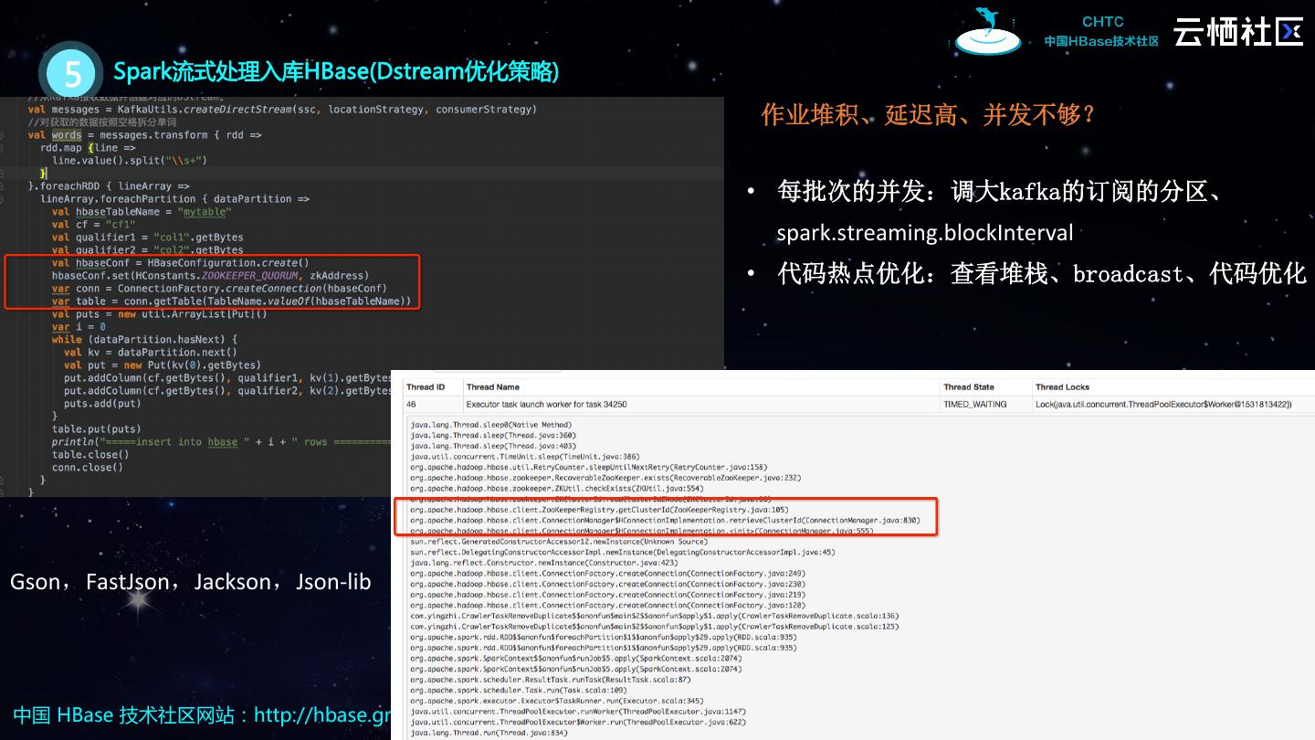 18 . 5 Spark流式处理入库HBase(Dstream优化策略) 作业堆积、延迟高、并发不够? • 每批次的并发:调大kafka的订阅的分区、 spark.streaming.blockInterval • 代码热点优化:查看堆栈、broadcast、代码优化 Gson,FastJson,Jackson,Json-lib 中国 HBase 技术社区网站:http://hbase.group