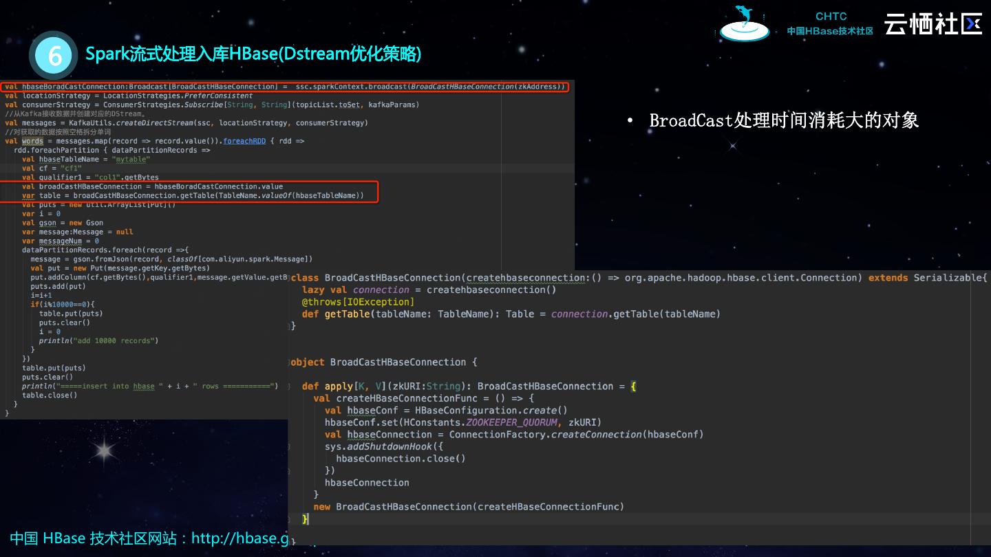 19 . 6 Spark流式处理入库HBase(Dstream优化策略) • BroadCast处理时间消耗大的对象 中国 HBase 技术社区网站:http://hbase.group
