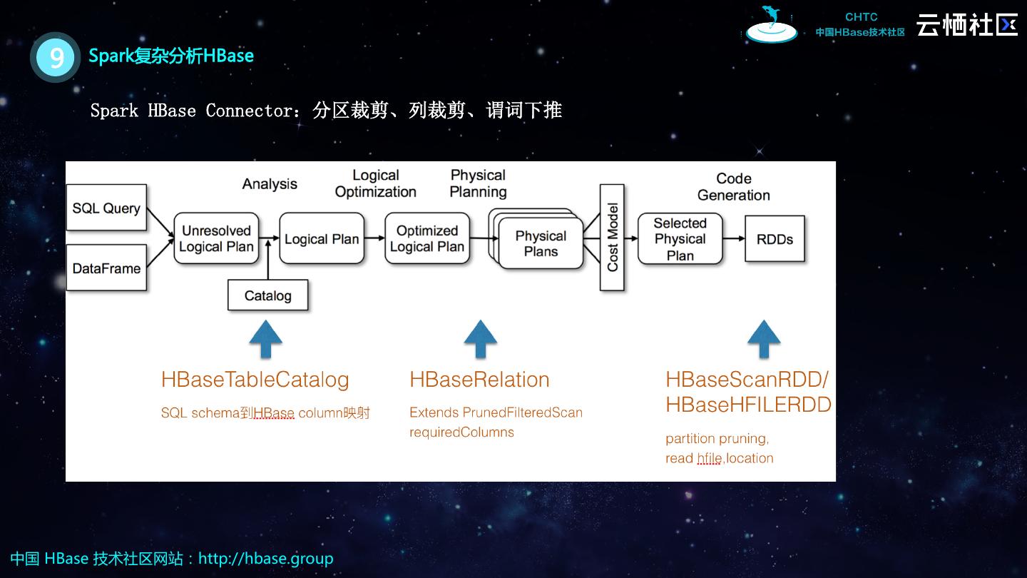 22 . 9 Spark复杂分析HBase Spark HBase Connector:分区裁剪、列裁剪、谓词下推 中国 HBase 技术社区网站:http://hbase.group