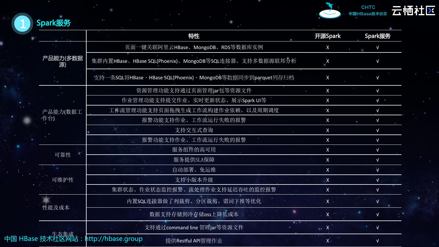 26 . 1 Spark服务 特性 开源Spark Spark服务 页面一键关联阿里云HBase、MongoDB、RDS等数据库实例 X √ 产品能力(多数据 集群内置HBase、HBase SQL(Phoenix)、MongoDB等SQL连接器。支持多数据源联邦分析 X √ 源) 支持一条SQL将HBase、HBase SQL(Phoenix)、MongoDB等数据同步到parquet列存归档 X √ 资源管理功能支持通过页面管理jar包等资源文件 X √ 作业管理功能支持提交作业、实时更新状态、展示Spark UI等 X √ 产品能力(数据工 工作流管理功能支持页面拖拽生成工作流构建作业依赖、以及周期调度 X √ 作台) 报警功能支持作业、工作流运行失败的报警 X √ 支持交互式查询 X √ 报警功能支持作业、工作流运行失败的报警 X √ 服务组件的高可用 X √ 可靠性 服务提供SLA保障 X √ 自动部署、免运维 X √ 可维护性 支持小版本升级 X √ 集群状态、作业状态监控报警、流处理作业支持延迟吞吐的监控报警 X √ 内置SQL连接器做了列裁剪、分区裁剪、谓词下推等优化 X √ 性能及成本 数据支持存储到冷存储oss上降低成本 X √ 支持通过command line 管理jar等资源文件 X √ 生态集成 中国 HBase 技术社区网站:http://hbase.group 提供ResUul API管理作业 X √