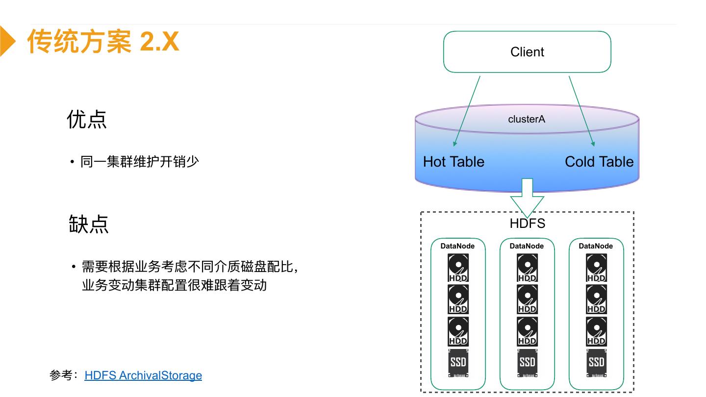8 .传统⽅方案 2.X Client 优点 clusterA • 同⼀一集群维护开销少 Hot Table Cold Table 缺点 HDFS DataNode DataNode DataNode • 需要根据业务考虑不不同介质磁盘配⽐比, 业务变动集群配置很难跟着变动 参考:HDFS ArchivalStorage
