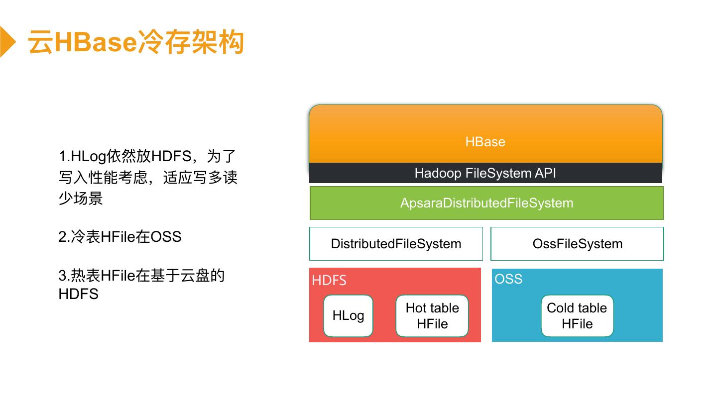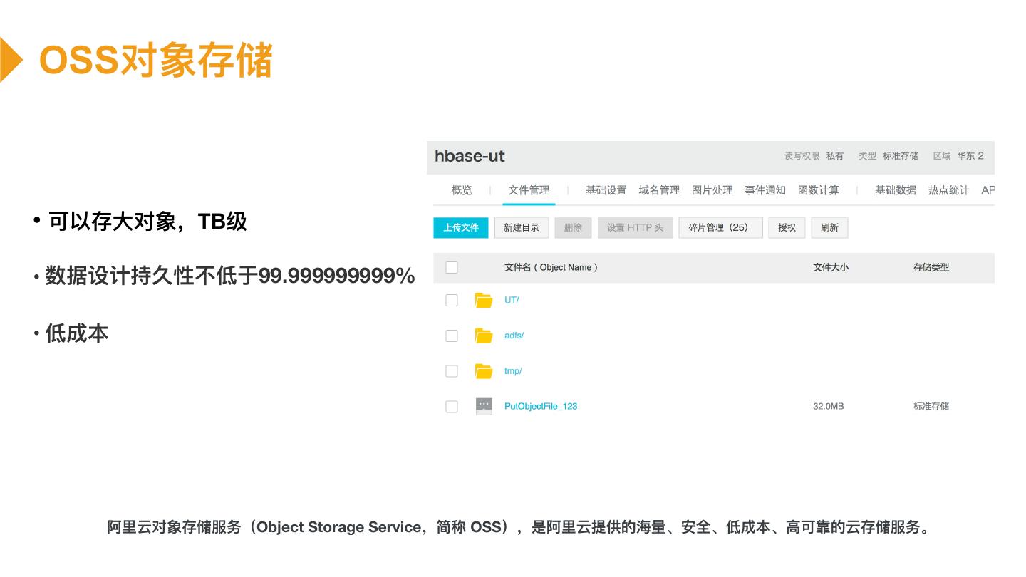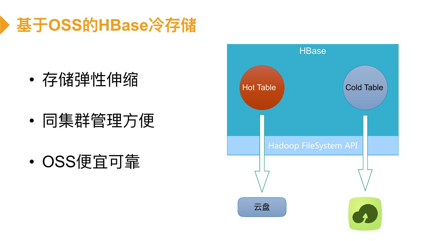 11 .基于OSS的HBase冷存储 HBase • 存储弹性伸缩 Hot Table Cold Table • 同集群管理理⽅方便便 Hadoop FileSystem API • OSS便便宜可靠 云盘