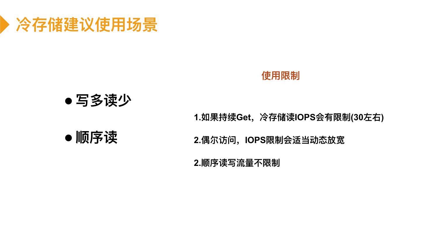 22 .冷存储建议使⽤用场景 使⽤用限制 • 写多读少 1.如果持续Get,冷存储读IOPS会有限制(30左右) • 顺序读 2.偶尔访问,IOPS限制会适当动态放宽 2.顺序读写流量量不不限制