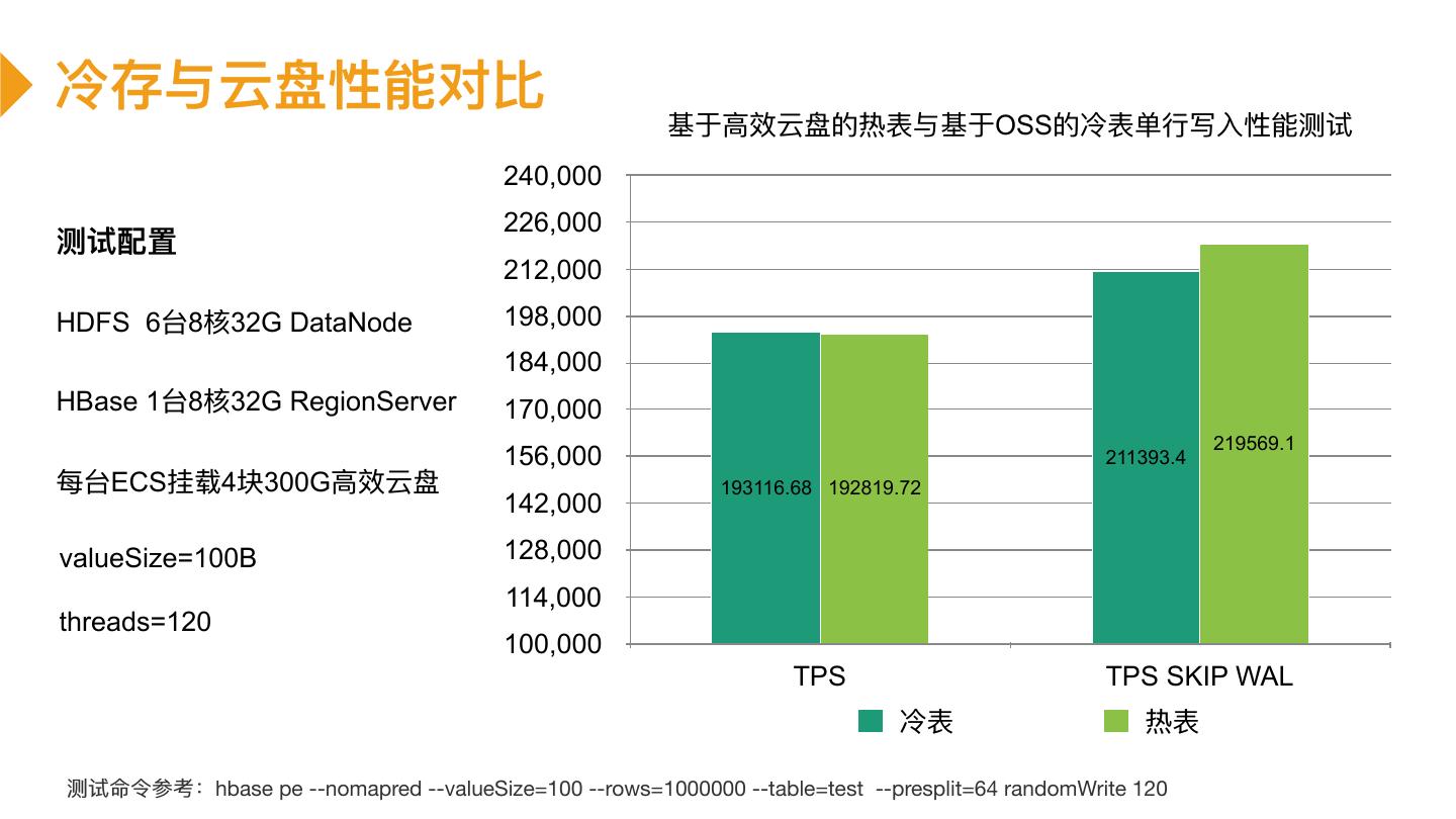 23 .冷存与云盘性能对⽐比 基于⾼高效云盘的热表与基于OSS的冷表单⾏行行写⼊入性能测试 240,000 226,000 测试配置 212,000 HDFS 6台8核32G DataNode 198,000 184,000 HBase 1台8核32G RegionServer 170,000 219569.1 156,000 211393.4 每台ECS挂载4块300G⾼高效云盘 193116.68 192819.72 142,000 valueSize=100B 128,000 114,000 threads=120 100,000 TPS TPS SKIP WAL 冷表 热表 测试命令参考:hbase pe --nomapred --valueSize=100 --rows=1000000 --table=test --presplit=64 randomWrite 120