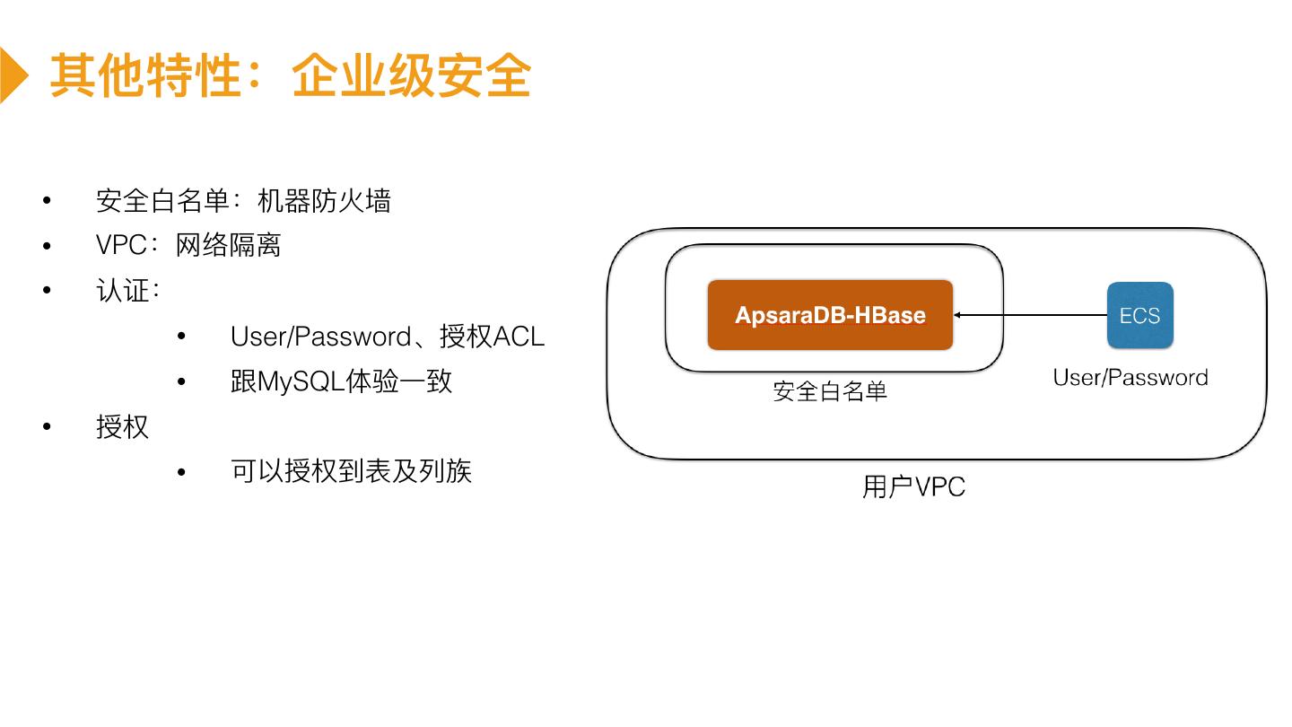 24 .其他特性:企业级安全 • 安全⽩白名单:机器器防⽕火墙 • VPC:⽹网络隔离 • 认证: • User/Password、授权ACL • 跟MySQL体验⼀一致 • 授权 • 可以授权到表及列列族