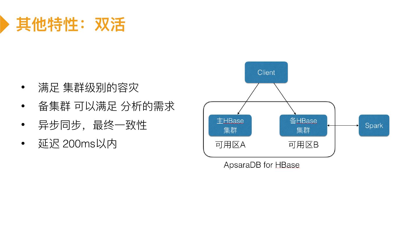 25 .其他特性:双活 • 满⾜足 集群级别的容灾 • 备集群 可以满⾜足 分析的需求 • 异步同步,最终⼀一致性 • 延迟 200ms以内