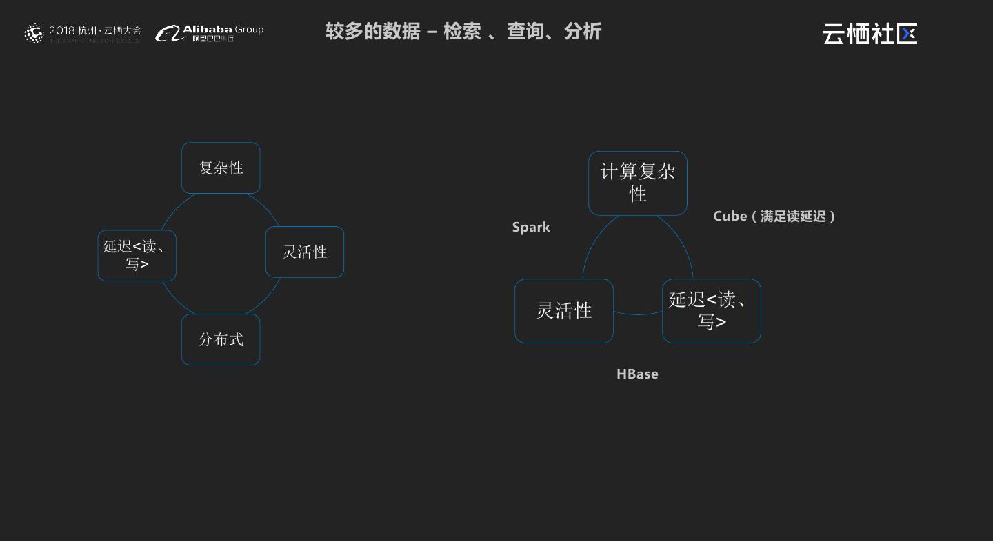 6 . 较多的数据 – 检索 、查询、分析 复杂性 计算复杂 性 Cube(满足读延迟) Spark 延迟<读、 灵活性 写> 延迟<读、 灵活性 写> 分布式 HBase