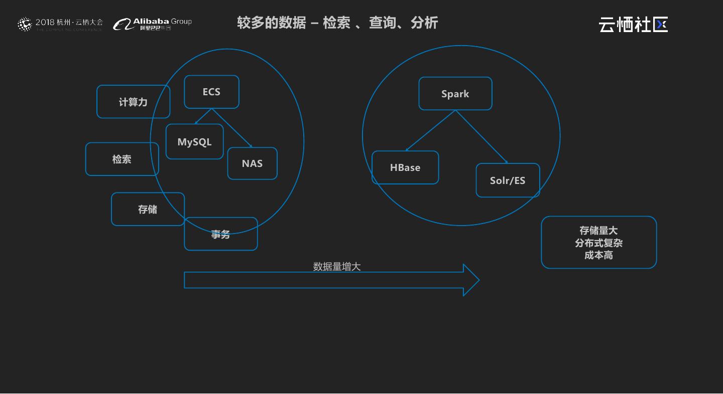 7 . 较多的数据 – 检索 、查询、分析 ECS Spark 计算力 MySQL 检索 NAS HBase Solr/ES 存储 事务 存储量大 分布式复杂 成本高 数据量增大