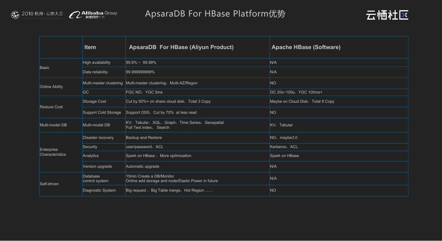 18 . ApsaraDB For HBase Platform优势 Item ApsaraDB For HBase (Aliyun Product) Apache HBase (Software) High availability 99.9% ~ 99.99% N/A Basic Data reliability 99.999999999% N/A Multi-master clustering Multi-master clustering,Multi-AZ/Regon NO Online Ability GC FGC NO,YGC 5ms GC 20s~100s,YGC 100ms+ Storage Cost Cut by 50%+ on share cloud disk,Total 3 Copy Maybe on Cloud Disk,Total 9 Copy Reduce Cost Support Cold Storage Support OSS,Cut by 70% at less read NO KV,Tabular,SQL,Graph,Time Series,Geospatial Multi-model DB Multi-model DB KV,Tabular Full Text index, Search Disaster recovery Backup and Restore NO,maybe3.0 Security user/password,ACL Kerberos,ACL Enterprise Characteristics Analytics Spark on HBase ,More optimization Spark on HBase Version upgrade Automatic upgrade N/A Database 15min Create a DB/Monitor N/A control system Online add storage and node/Elastic Power in future Self-driven Diagnostic System Big request ,Big Table merge,Hot Region …… NO
