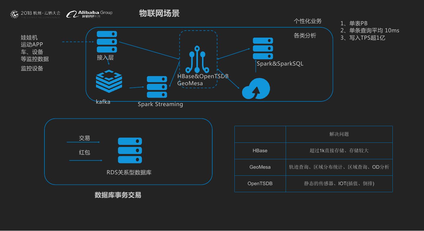 21 . 物联网场景 个性化业务 1、单表PB 2、单条查询平均 10ms 娃娃机 各类分析 3、写入TPS超1亿 运动APP 车、设备 等监控数据 接入层 Spark&SparkSQL 监控设备 HBase&OpenTSDB GeoMesa kafka Spark Streaming 解决问题 交易 红包 HBase 超过1k直接存储、存储较大 GeoMesa 轨迹查询、区域分布统计、区域查询、OD分析 RDS关系型数据库 OpenTSDB 静态的传感器、IOT(插值、倒排) 数据库事务交易