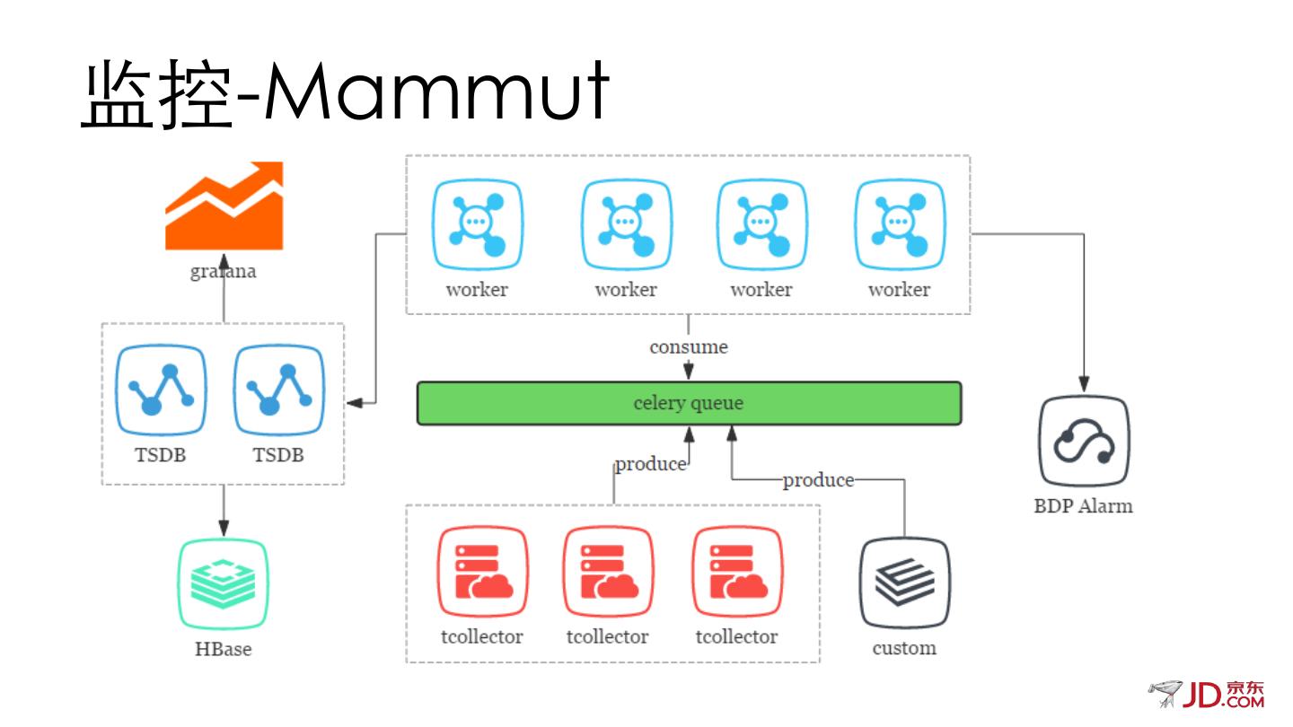 22 .监控 Mummut监控 目标:集群jmx、日志、服务器运行指标等信息 处理能力:秒级8Kw 架构实现:tcollector + celery + redis + tsdb + granfa + bdp_phoenix 其它监控 ganglia、mdc、ops、ump 巡检 基础服务、磁盘健康、swap、连接数、僵尸进程、集群配置
