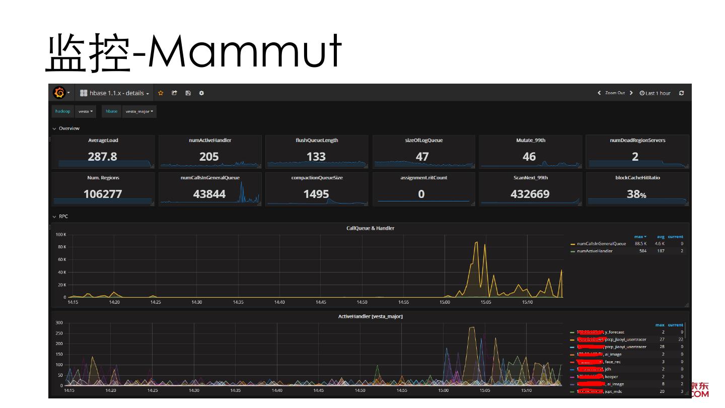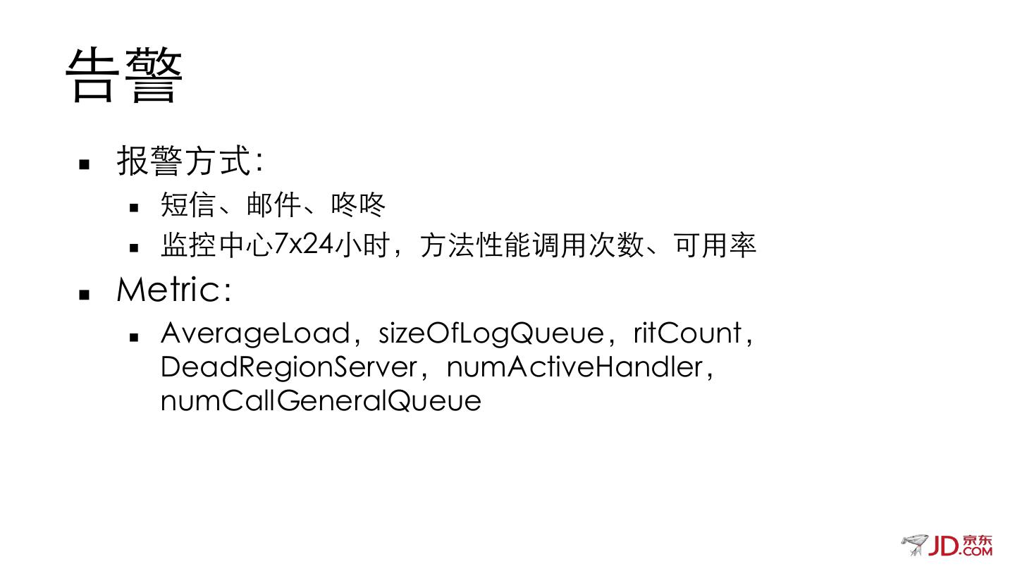 25 .告警 报警方式: 短信、邮件、咚咚 监控中心7x24小时,方法性能调用次数、可用率 Metric: AverageLoad,sizeOfLogQueue,ritCount, DeadRegionServer,numActiveHandler, numCallGeneralQueue