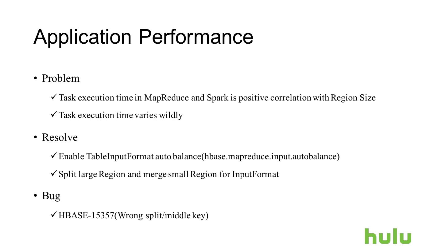 15 .Application Performance • Problem ü Task execution time in MapReduce and Spark is positive correlation with Region Size ü Task execution time varies wildly • Resolve ü Enable TableInputFormat auto balance(hbase.mapreduce.input.autobalance) ü Split large Region and merge small Region for InputFormat • Bug ü HBASE-15357(Wrong split/middle key)