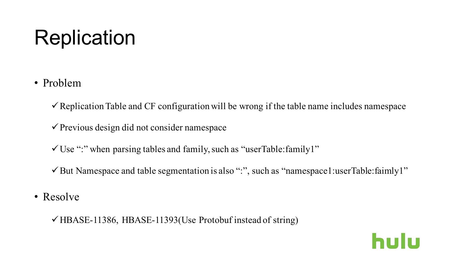23 .Replication • Problem ü Replication Table and CF configuration will be wrong if the table name includes namespace ü Previous design did not consider namespace ü Use “:” when parsing tables and family, such as “userTable:family1” ü But Namespace and table segmentation is also “:”, such as “namespace1:userTable:faimly1” • Resolve ü HBASE-11386, HBASE-11393(Use Protobuf instead of string)