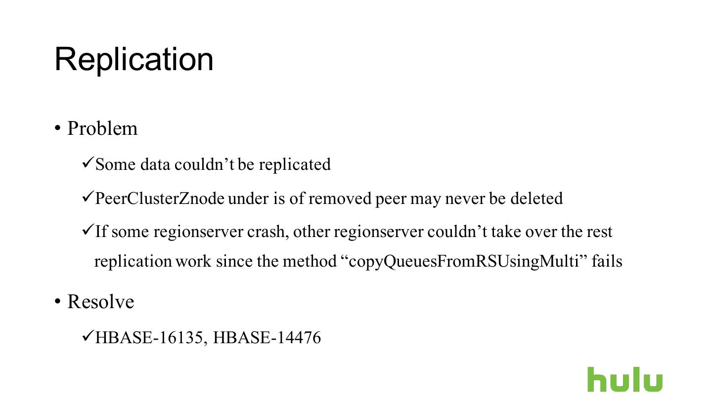 24 .Replication • Problem üSome data couldn’t be replicated üPeerClusterZnode under is of removed peer may never be deleted üIf some regionserver crash, other regionserver couldn’t take over the rest replication work since the method “copyQueuesFromRSUsingMulti” fails • Resolve üHBASE-16135, HBASE-14476