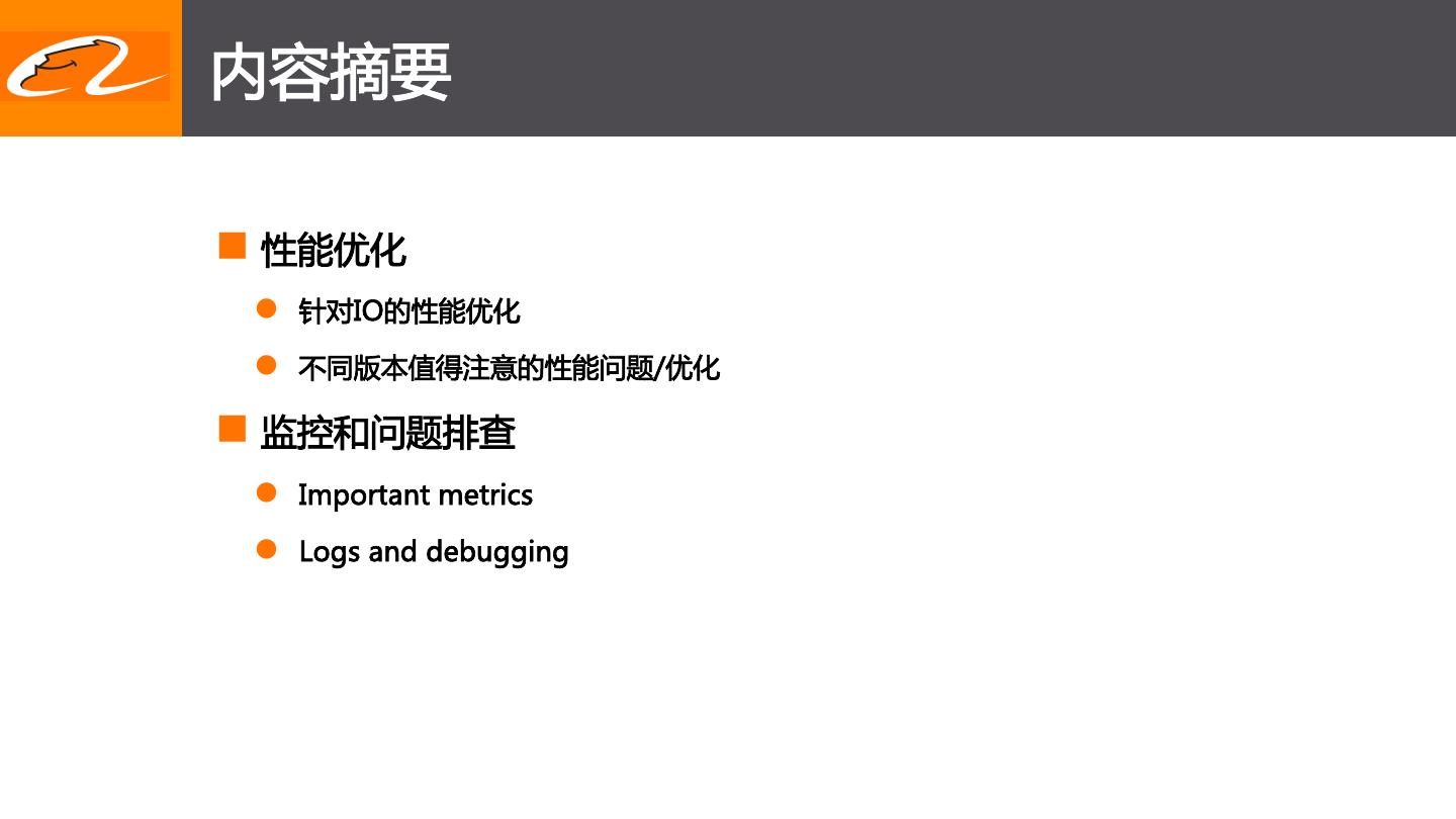 2 .内容摘要 n 性能优化 l 针对IO的性能优化 l 不同版本值得注意的性能问题/优化 n 监控和问题排查 l Important metrics l Logs and debugging