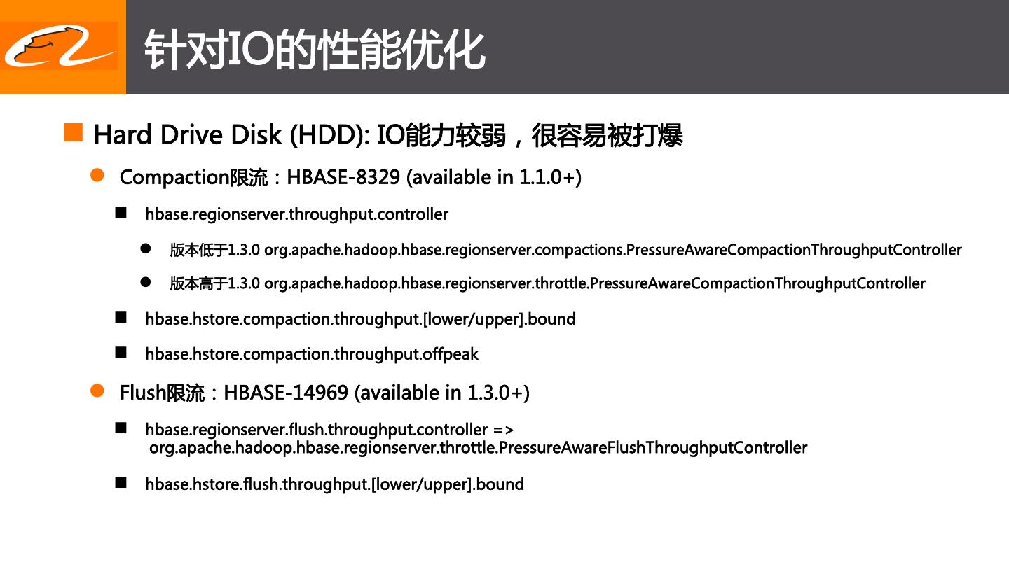 3 . 针对IO的性能优化 n Hard Drive Disk (HDD): IO能力较弱,很容易被打爆 l Compaction限流:HBASE-8329 (available in 1.1.0+) n hbase.regionserver.throughput.controller l 版本低于1.3.0 org.apache.hadoop.hbase.regionserver.compactions.PressureAwareCompactionThroughputController l 版本高于1.3.0 org.apache.hadoop.hbase.regionserver.throttle.PressureAwareCompactionThroughputController n hbase.hstore.compaction.throughput.[lower/upper].bound n hbase.hstore.compaction.throughput.offpeak l Flush限流:HBASE-14969 (available in 1.3.0+) n hbase.regionserver.flush.throughput.controller => org.apache.hadoop.hbase.regionserver.throttle.PressureAwareFlushThroughputController n hbase.hstore.flush.throughput.[lower/upper].bound