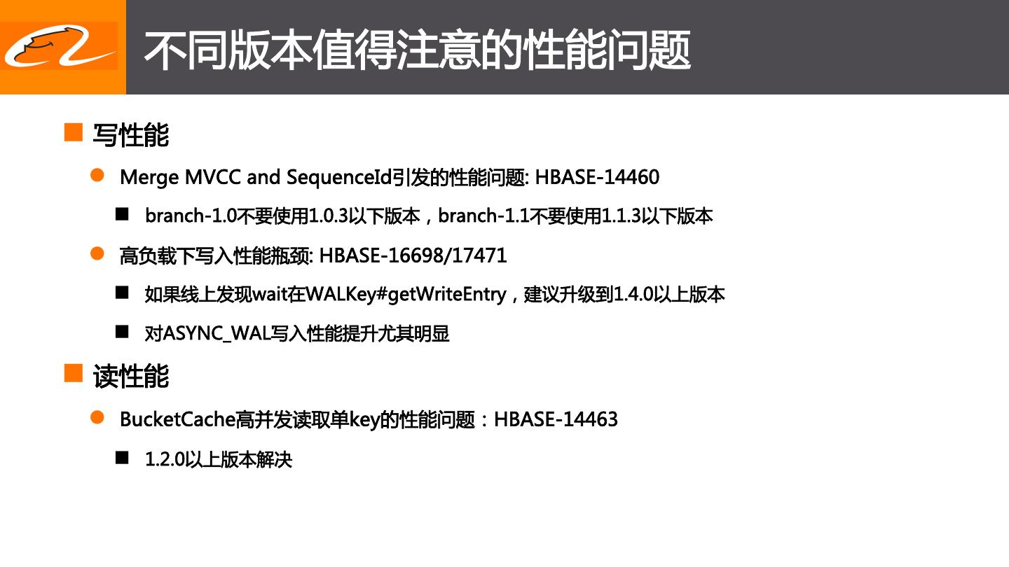 8 . 不同版本值得注意的性能问题 n 写性能 l Merge MVCC and SequenceId引发的性能问题: HBASE-14460 n branch-1.0不要使用1.0.3以下版本,branch-1.1不要使用1.1.3以下版本 l 高负载下写入性能瓶颈: HBASE-16698/17471 n 如果线上发现wait在WALKey#getWriteEntry,建议升级到1.4.0以上版本 n 对ASYNC_WAL写入性能提升尤其明显 n 读性能 l BucketCache高并发读取单key的性能问题:HBASE-14463 n 1.2.0以上版本解决
