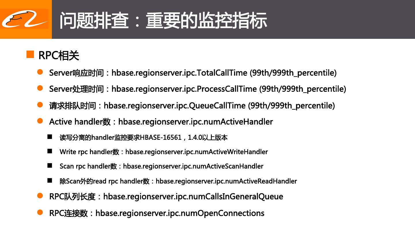 9 . 问题排查:重要的监控指标 n RPC相关 l Server响应时间:hbase.regionserver.ipc.TotalCallTime (99th/999th_percentile) l Server处理时间:hbase.regionserver.ipc.ProcessCallTime (99th/999th_percentile) l 请求排队时间:hbase.regionserver.ipc.QueueCallTime (99th/999th_percentile) l Active handler数:hbase.regionserver.ipc.numActiveHandler n 读写分离的handler监控要求HBASE-16561,1.4.0以上版本 n Write rpc handler数:hbase.regionserver.ipc.numActiveWriteHandler n Scan rpc handler数:hbase.regionserver.ipc.numActiveScanHandler n 除Scan外的read rpc handler数:hbase.regionserver.ipc.numActiveReadHandler l RPC队列长度:hbase.regionserver.ipc.numCallsInGeneralQueue l RPC连接数:hbase.regionserver.ipc.numOpenConnections