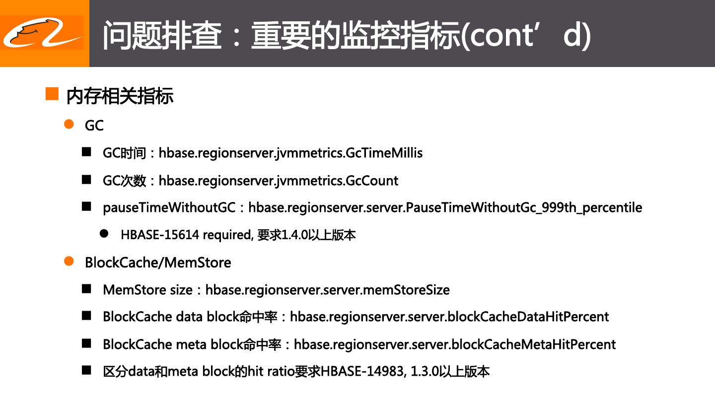 13 . 问题排查:重要的监控指标(cont’d) n 内存相关指标 l GC n GC时间:hbase.regionserver.jvmmetrics.GcTimeMillis n GC次数:hbase.regionserver.jvmmetrics.GcCount n pauseTimeWithoutGC:hbase.regionserver.server.PauseTimeWithoutGc_999th_percentile l HBASE-15614 required, 要求1.4.0以上版本 l BlockCache/MemStore n MemStore size:hbase.regionserver.server.memStoreSize n BlockCache data block命中率:hbase.regionserver.server.blockCacheDataHitPercent n BlockCache meta block命中率:hbase.regionserver.server.blockCacheMetaHitPercent n 区分data和meta block的hit ratio要求HBASE-14983, 1.3.0以上版本