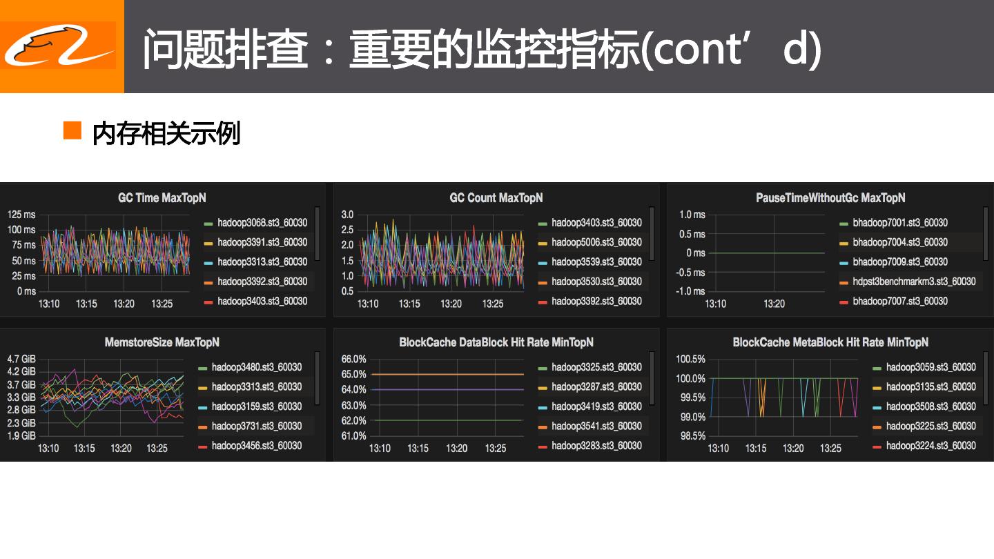 15 . 问题排查:重要的监控指标(cont’d) n RegionServer单机指标 l Region大小:hbase.regionserver.regions.storeFileSize l Region写操作数:hbase.regionserver.regions. l Region get操作数:hbase.regionserver.regions.get_num_ops l Region scan操作数:hbase.regionserver.regions.scanSize_num_ops l Compaction队列长度:hbase.regionserver.server.compactionQueueLength l Flush队列长度:hbase.regionserver.server.flushQueueLength
