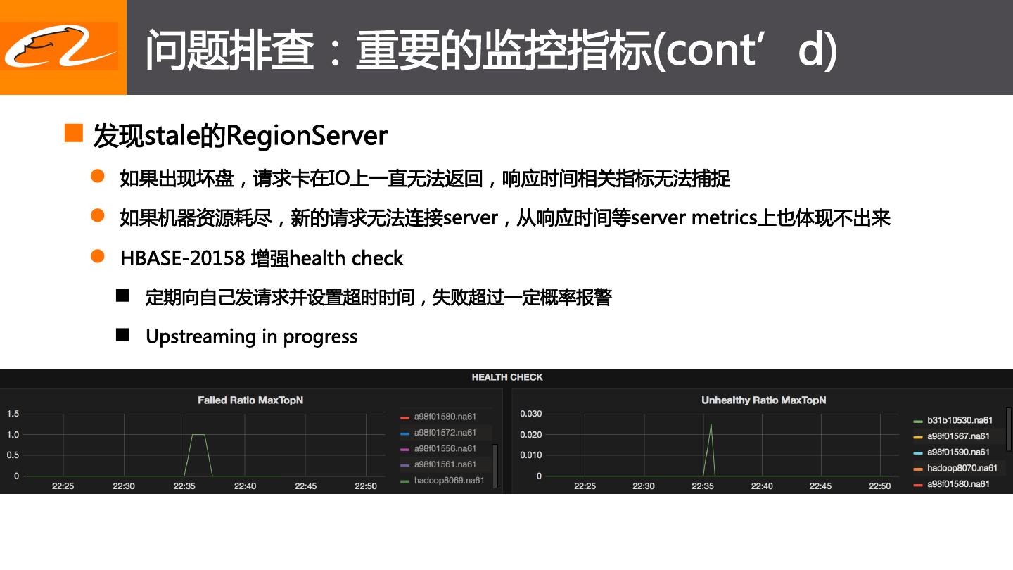 17 . 问题排查:重要的监控指标(cont’d) n 发现stale的RegionServer l 如果出现坏盘,请求卡在IO上一直无法返回,响应时间相关指标无法捕捉 l 如果机器资源耗尽,新的请求无法连接server,从响应时间等server metrics上也体现不出来 l HBASE-20158 增强health check n 定期向自己发请求并设置超时时间,失败超过一定概率报警 n Upstreaming in progress