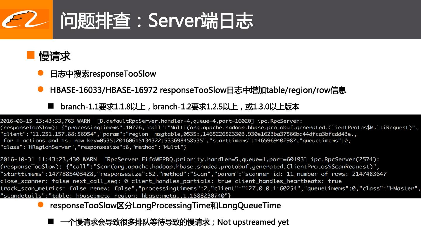 18 . 问题排查:Server端日志 n 慢请求 l 日志中搜索responseTooSlow l HBASE-16033/HBASE-16972 responseTooSlow日志中增加table/region/row信息 n branch-1.1要求1.1.8以上,branch-1.2要求1.2.5以上,或1.3.0以上版本 l responseTooSlow区分LongProcessingTime和LongQueueTime n 一个慢请求会导致很多排队等待导致的慢请求;Not upstreamed yet