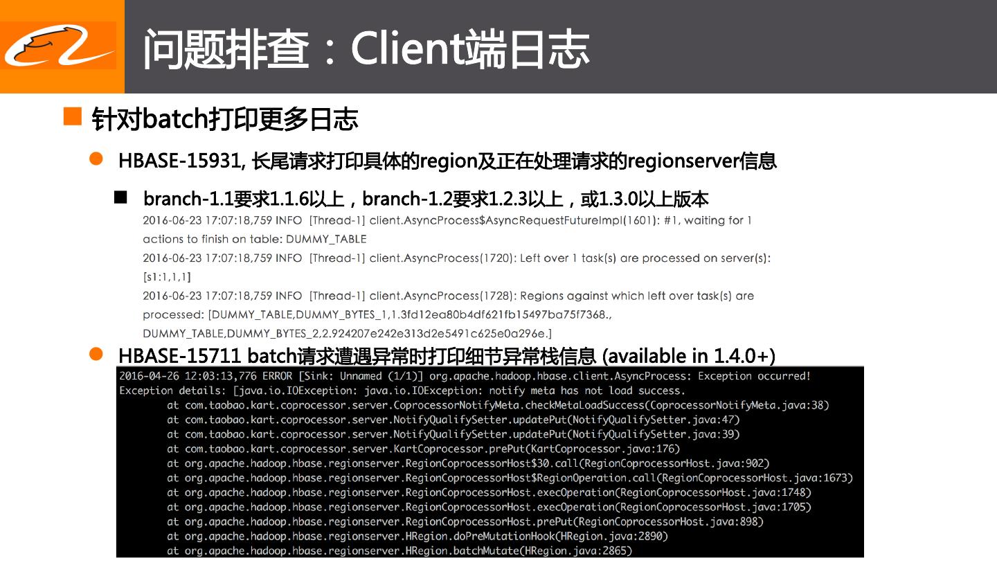 19 . 问题排查:Client端日志 n 针对batch打印更多日志 l HBASE-15931, 长尾请求打印具体的region及正在处理请求的regionserver信息 n branch-1.1要求1.1.6以上,branch-1.2要求1.2.3以上,或1.3.0以上版本 l HBASE-15711 batch请求遭遇异常时打印细节异常栈信息 (available in 1.4.0+)